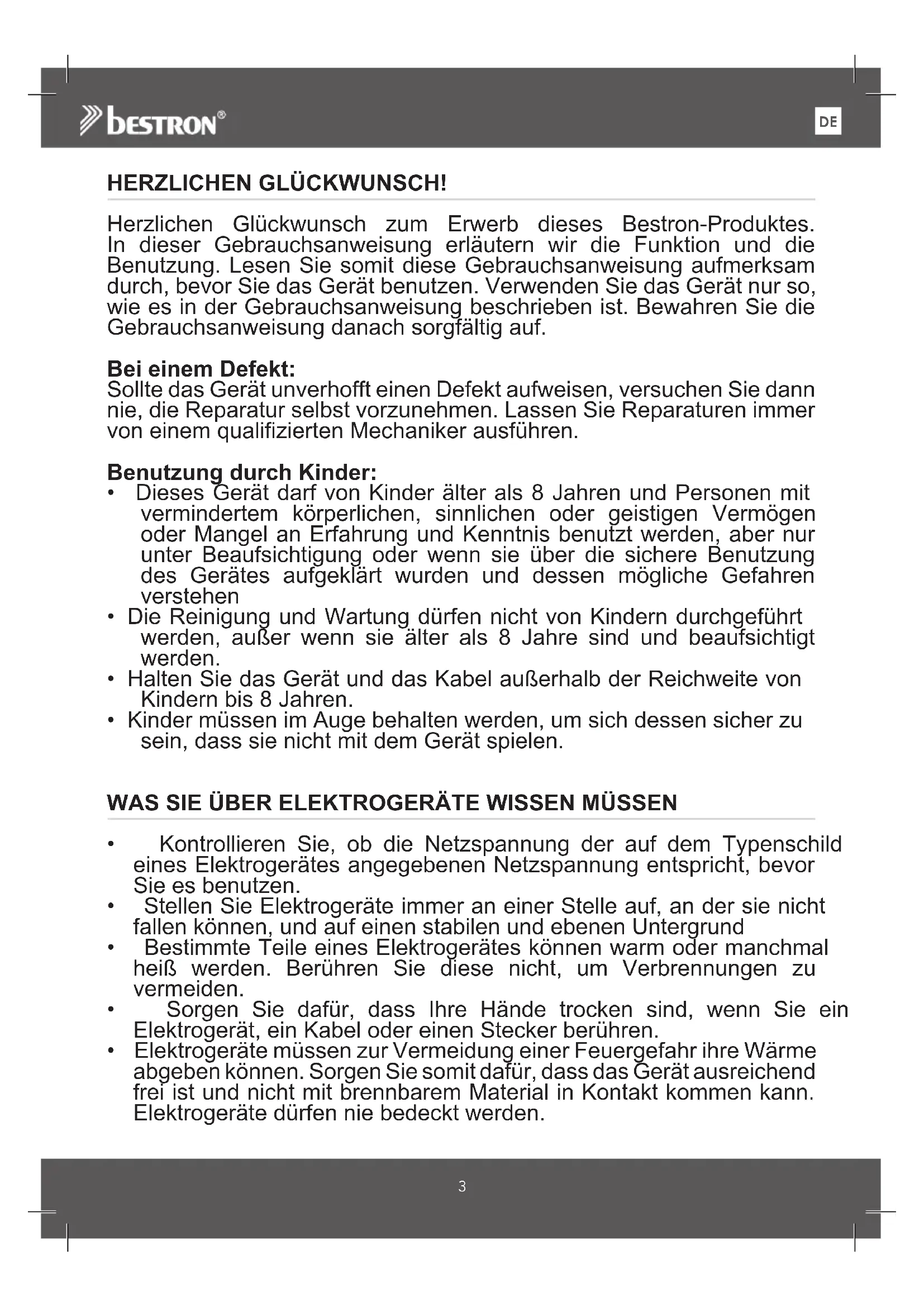 HERZLICHEN GLÜCKWUNSCH! Herzlichen Glückwunsch zum Erwerb dieses Bestron-Produktes. In dieser Gebrauchsanweisung erläutern wir die Funktion und die Benutzung. Lesen Sie somit diese Gebrauchsanweisung aufmerksam durch, bevor Sie das Gerät benutzen. Verwenden Sie das Gerät nur so, wie es in der Gebrauchsanweisung beschrieben ist. Bewahren Sie die Gebrauchsanweisung danach sorgfältig auf. Bei einem Defekt: Sollte das Gerät unverhofft einen Defekt aufweisen, versuchen Sie dann nie, die Reparatur selbst vorzunehmen. Lassen Sie Reparaturen immer von einem qualifizierten Mechaniker ausführen. Benutzung durch Kinder: