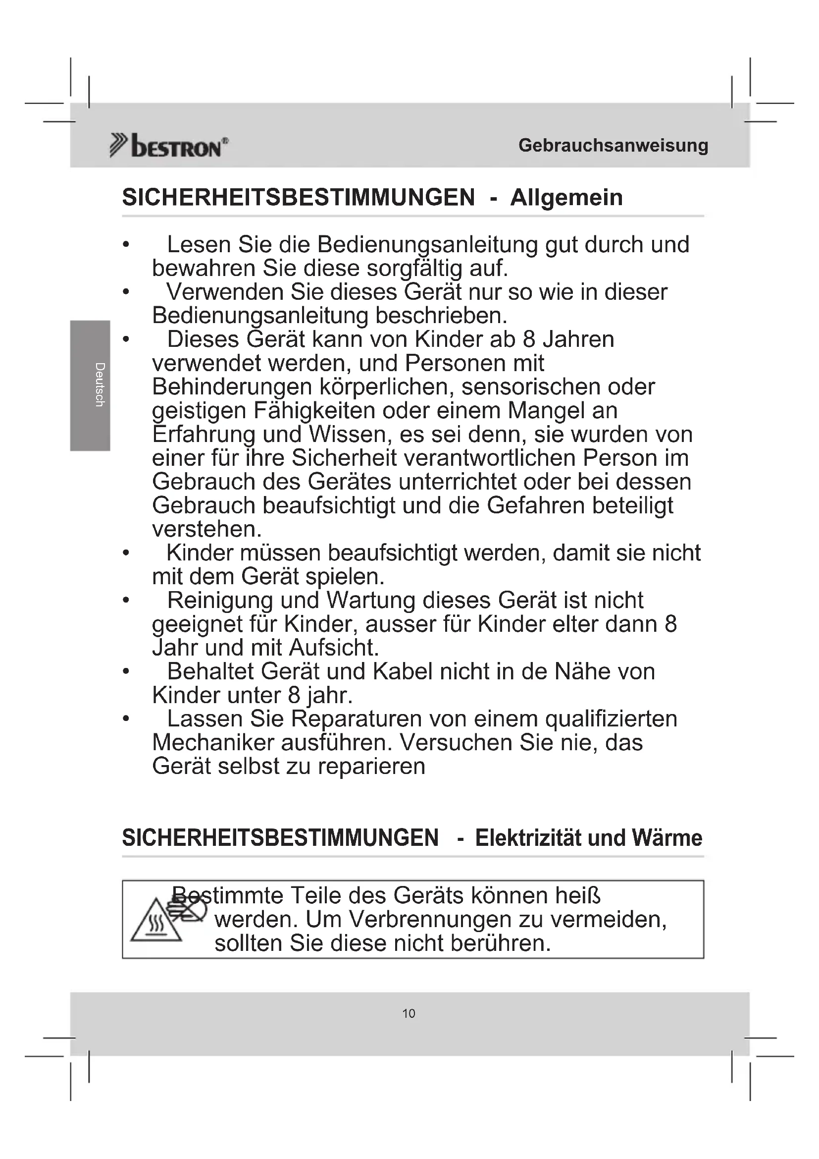 GarantiekeinRechtaufErstattungeineseventuellenSchadensein.Der ImporteurkanninkeinemFallfüreventuelleFolgeschädenoderirgendwelche anderenFolgenhaftbargemachtwerden,diedurchdasvonihmgelieferteoderin VerbindungmitdemvonihmgeliefertenGerätentstandensind. 10.UmGarantieleistungeninAnspruchzunehmen,wendenSiesichtdirektanIhren Händler.BestronbietetauchdieMöglichkeitdirektmitdemWerkskundendienst abzuwickeln.Voraussetzunghierfürist,dassSiesichzunächsttelefonisch,per FaxoderMailandenWerkskundendienstwenden.BitteschickenSiekeineGeräte unaufgefordert.InsbesonderedürfenPaketeniemalsunfreieingesendetwerden. SprechenSiedaherzuerstmituns.WirsagenIhnenwieSieIhrGerätanuns einsendensollen. 11.DasGeräteignetsichnichtfürdieprofessionelleVerwendung.Gebrauchsanweisung