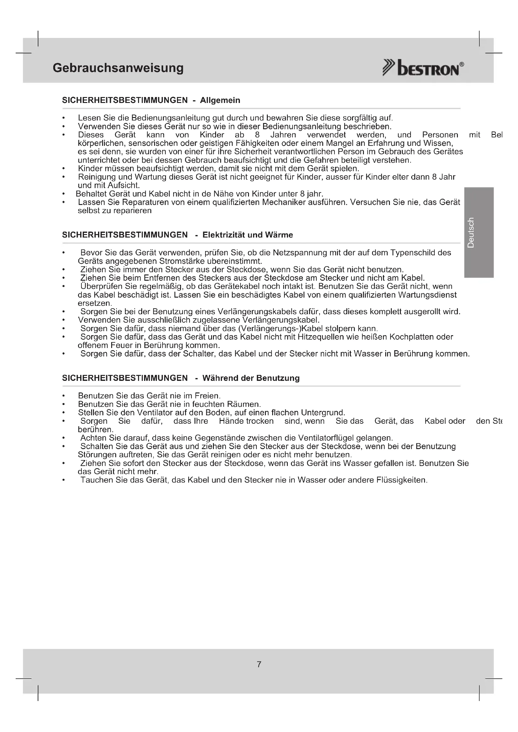 auf Erstattung eines eventuellen Schadens ein. Der Importeur kann in keinem Fall für eventuelle Folgeschäden oder irgendwelche anderen Folgen haftbar gemacht werden, die durch das von ihm gelieferteoderinVerbindungmitdemvonihmgeliefertenGerätentstandensind. 10.UmGarantieleistungeninAnspruchzunehmen,wendenSiesichtdirektanIhrenHändler.Bestronbietet auchdieMöglichkeitdirektmitdemWerkskundendienstabzuwickeln.Voraussetzunghierfürist,dass Siesich zunächsttelefonisch, perFax oderMail anden Werkskundendienstwenden.Bitteschicken Sie keine Geräte unaufgefordert. Insbesondere dürfen Pakete niemals unfrei eingesendet werden. SprechenSiedaherzuerstmituns.WirsagenIhnenwieSieIhrGerätanunseinsendensollen. 11.DasGeräteignetsichnichtfürdieprofessionelleVerwendung. KUNDENDIENST Sollte unerwartet eine Störung auftreten dann können Sie sich mit dem BESTRON-Kundendienst in Verbindungsetzen: www.bestron.com/service