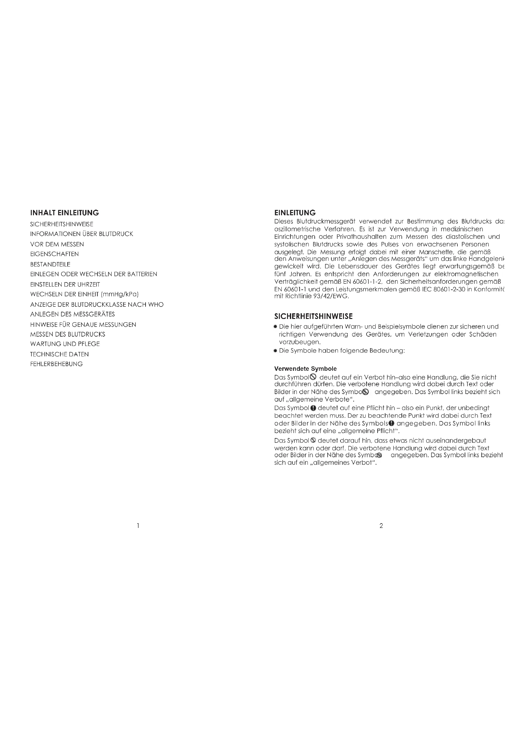 TECHNISCHE DATEN FEHLERBEHEBUNG EINLEITUNG Dieses Blutdruckmessgerät verwendet zur Bestimmung des Blutdrucks das oszillometrische Verfahren. Es ist zur Verwendung in medizinischen Einrichtungen oder Privathaushalten zum Messen des diastolischen und systolischen Blutdrucks sowie des Pulses von erwachsenen Personen ausgelegt. Die Messung erfolgt dabei mit einer Manschette, die gemäß den Anweisungen unter „Anlegen des Messgeräts“ um das linke Handgelenk gewickelt wird. Die Lebensdauer des Gerätes liegt erwartungsgemäß bei fünf Jahren. Es entspricht den Anforderungen zur elektromagnetischen Verträglichkeit gemäß EN 60601-1-2, den Sicherheitsanforderungen gemäß EN 60601-1 und den Leistungsmerkmalen gemäß IEC 80601-2-30 in Konformität mit Richtlinie 93/42/EWG. SICHERHEITSHINWEISE Die hier aufgeführten Warn- und Beispielsymbole dienen zur sicheren und richtigen Verwendung des Gerätes, um Verletzungen oder Schäden vorzubeugen. Die Symbole haben folgende Bedeutung: Verwendete Symbole Das Symbol deutet auf ein Verbot hin–also eine Handlung, die Sie nicht durchführen dürfen. Die verbotene Handlung wird dabei durch Text oder Bilder in der Nähe des Symbols angegeben. Das Symbol links bezieht sich auf „allgemeine Verbote“. Das Symbol deutet auf eine Pflicht hin – also ein Punkt, der unbedingt beachtet werden muss. Der zu beachtende Punkt wird dabei durch Text oder Bilder in der Nähe des Symbols angegeben. Das Symbol links bezieht sich auf eine „allgemeine Pflicht“. Das Symbol deutet darauf hin, dass etwas nicht auseinandergebaut werden kann oder darf. Die verbotene Handlung wird dabei durch Text oder Bilder in der Nähe des Symbols angegeben. Das Symbol links bezieht sich auf ein „allgemeines Verbot“.3 4 Achtung – vor Verwendung durchlesen Warnung Anwendungsteil Typ BF Kennzeichnung von Elektro- und Elektronikgeräten gemäß Artikel 11(2) der Richtlinie 2002/96/EG (WEEE) Patienten sollten unbedingt die Anweisungen des Arztes befolgen und dürfen anhand der Messergebnisse keine Eigendiagnose oder Selbstbehandlung vornehmen, da dies gefährlich ist. Das Gerät darf nicht zur Diagnose von Krankheiten, ersten Hilfe oder kontinuierlichen Überwachung der Werte verwendet werden. Das Gerät darf nicht während des Transports oder einer chirurgischen Versorgung von Patienten eingesetzt werden. Es ist lediglich zur Verwendung im Haushalt oder an festen Standorten ausgelegt. Beenden Sie die Messung durch Drücken auf „ON/OFF“, wenn Sie sich mit der Manschette unwohl fühlen sollten oder die Manschette ohne Unterbrechung übermäßig aufgepumpt wird. Risiko für Sach- oder Personenschäden! Das Gerät darf nicht von Kindern unt er 12 Jahren oder Personen mit eingeschränkten physischen, sensorischen oder geistigen Fähigkeiten verwendet werden. Kinder im Alter von 12 bis 18 Jahren dürfen das Gerät nur unter Aufsicht eines Erwachsenen verwenden. Risiko für Sach- oder Personenschäden! Das Gerät darf ausschließlich zur Messung des Blutdrucks verwendet werden. In der näheren Umgebung des Gerätes dürfen keine Mobiltelefone verwendet werden. Das Gerät darf nicht in der Nähe von elektromagnetischen Feldern verwendet werden. Weder das Gerät noch die Manschette des Blutdruckmessgerätes dürfenauseinandergebaut, repariert oder umgebaut werden, da dies anderenfalls zu Fehlfunktionen führen könnte.