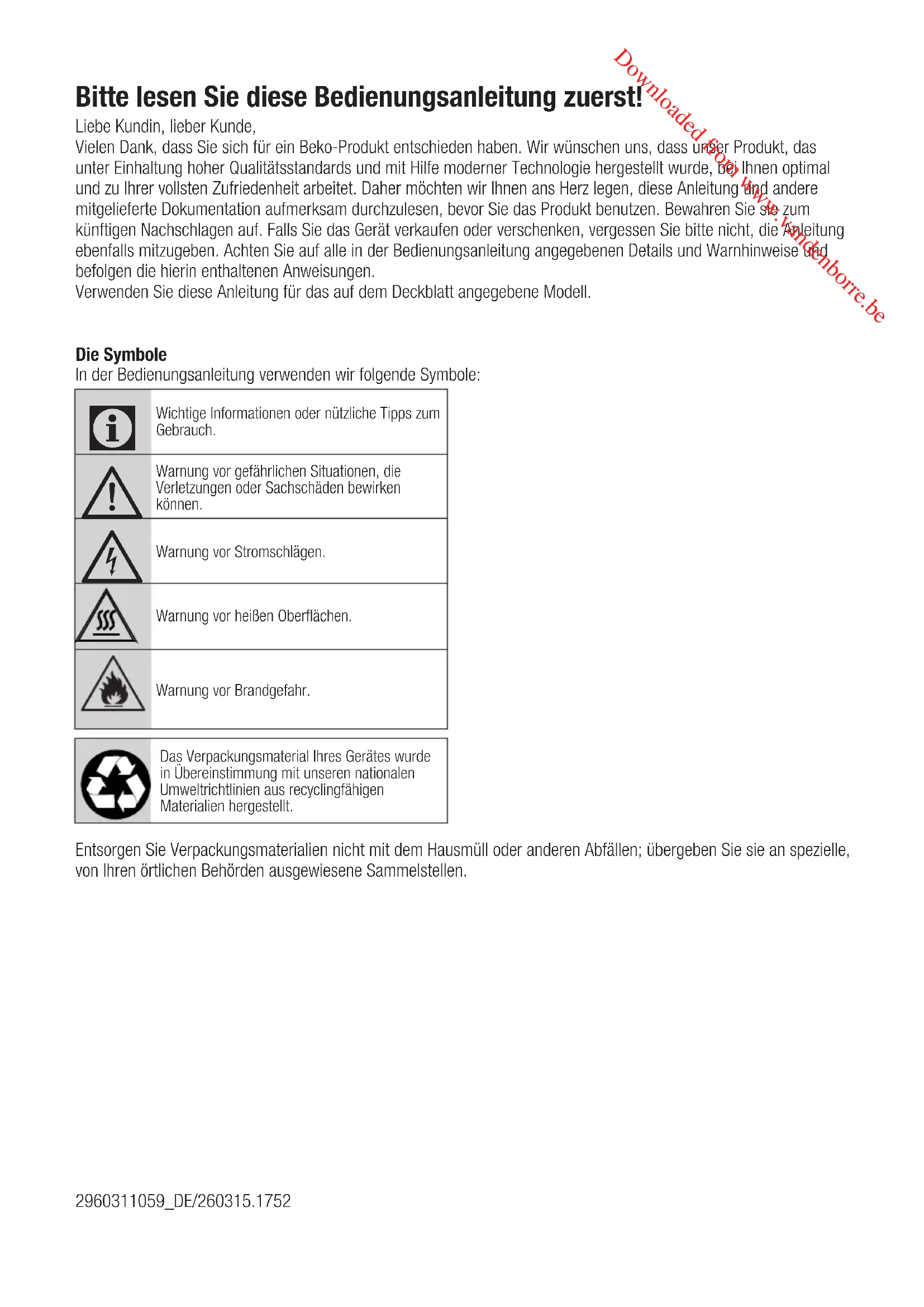 Si le problème persiste en dépit du respect de ces instructions, veuillez contacter votre revendeur ou un.service agréé. N‘essayez pas de réparer l‘appareil de vous-même Downloaded from www.vandenborre.beDownloaded from www.vandenborre.be2960311059_DE/260315.1752 Bitte lesen Sie diese Bedienungsanleitung zuerst! Liebe Kundin, lieber Kunde, Vielen Dank, dass Sie sich für ein Beko-Produkt entschieden haben. Wir wünschen uns, dass unser Produkt, das unter Einhaltung hoher Qualitätsstandards und mit Hilfe moderner Technologie hergestellt wurde, bei Ihnen optimal und zu Ihrer vollsten Zufriedenheit arbeitet. Daher möchten wir Ihnen ans Herz legen, diese Anleitung und andere mitgelieferte Dokumentation aufmerksam durchzulesen, bevor Sie das Produkt benutzen. Bewahren Sie sie zum künftigen Nachschlagen auf. Falls Sie das Gerät verkaufen oder verschenken, vergessen Sie bitte nicht, die Anleitung ebenfalls mitzugeben. Achten Sie auf alle in der Bedienungsanleitung angegebenen Details und Warnhinweise und befolgen die hierin enthaltenen Anweisungen. Verwenden Sie diese Anleitung für das auf dem Deckblatt angegebene Modell. Die Symbole In der Bedienungsanleitung verwenden wir folgende Symbole: