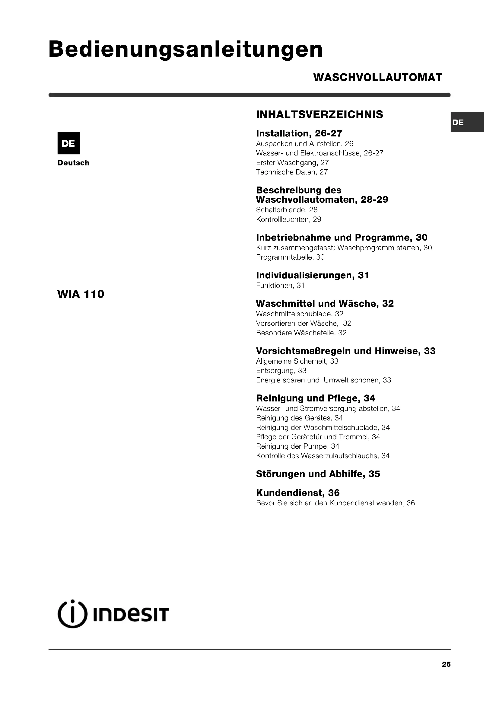 BEDIENUNGSANLEITUNG WIA 110 (EU) INDESIT