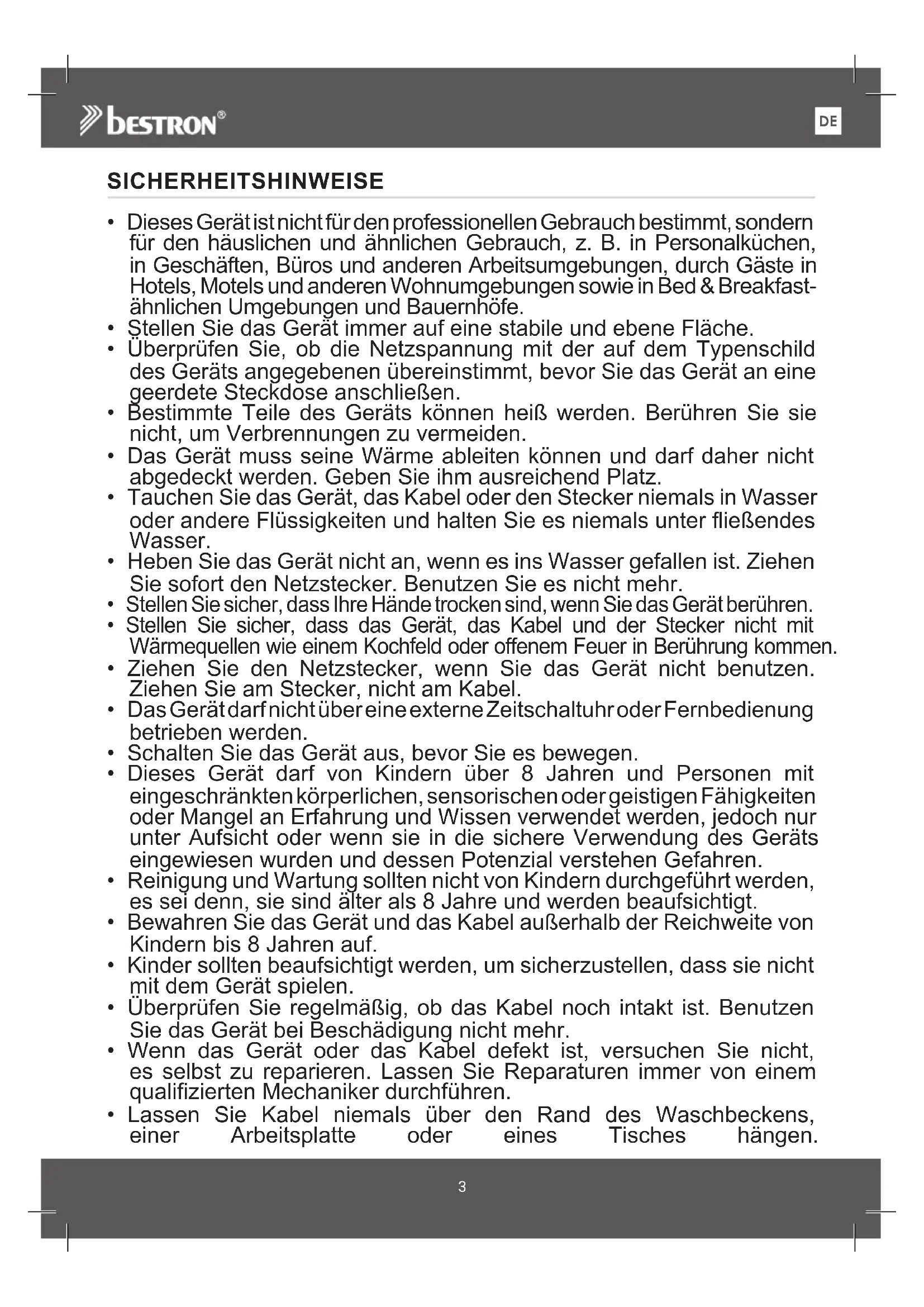 - Informieren Sie sich bei der Gemeinde nach der richtigen Sammelstelle bei Ihnen in der Nähe. DIENST Im unwahrscheinlichen Fall, dass eine Fehlfunktion auftritt, können Sie sich an den Bestron-Service wenden:www.bestron.com/service5
