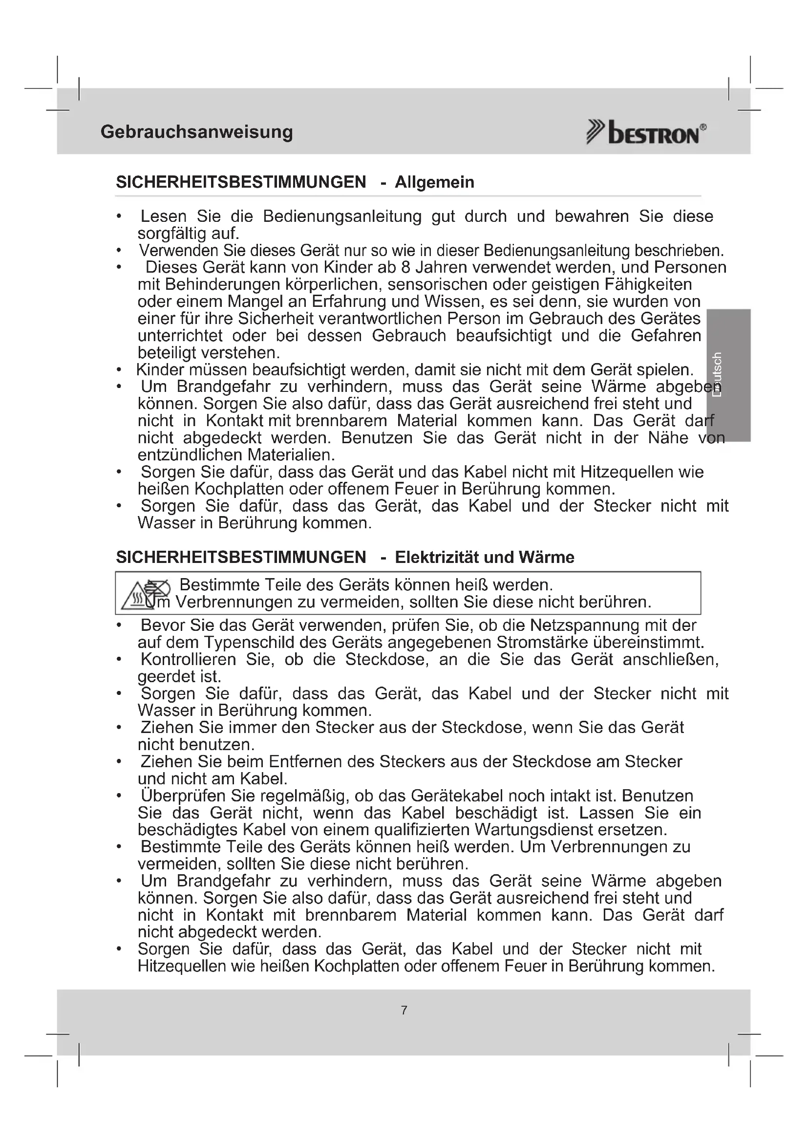 - Sorgen Sie dafür, dass das Gerät, das Kabel und der Stecker nicht mit Wasser in Berührung kommen. SICHERHEITSBESTIMMUNGEN - Elektrizität und Wärme Bestimmte Teile des Geräts können heiß werden. Um Verbrennungen zu vermeiden, sollten Sie diese nicht berühren.