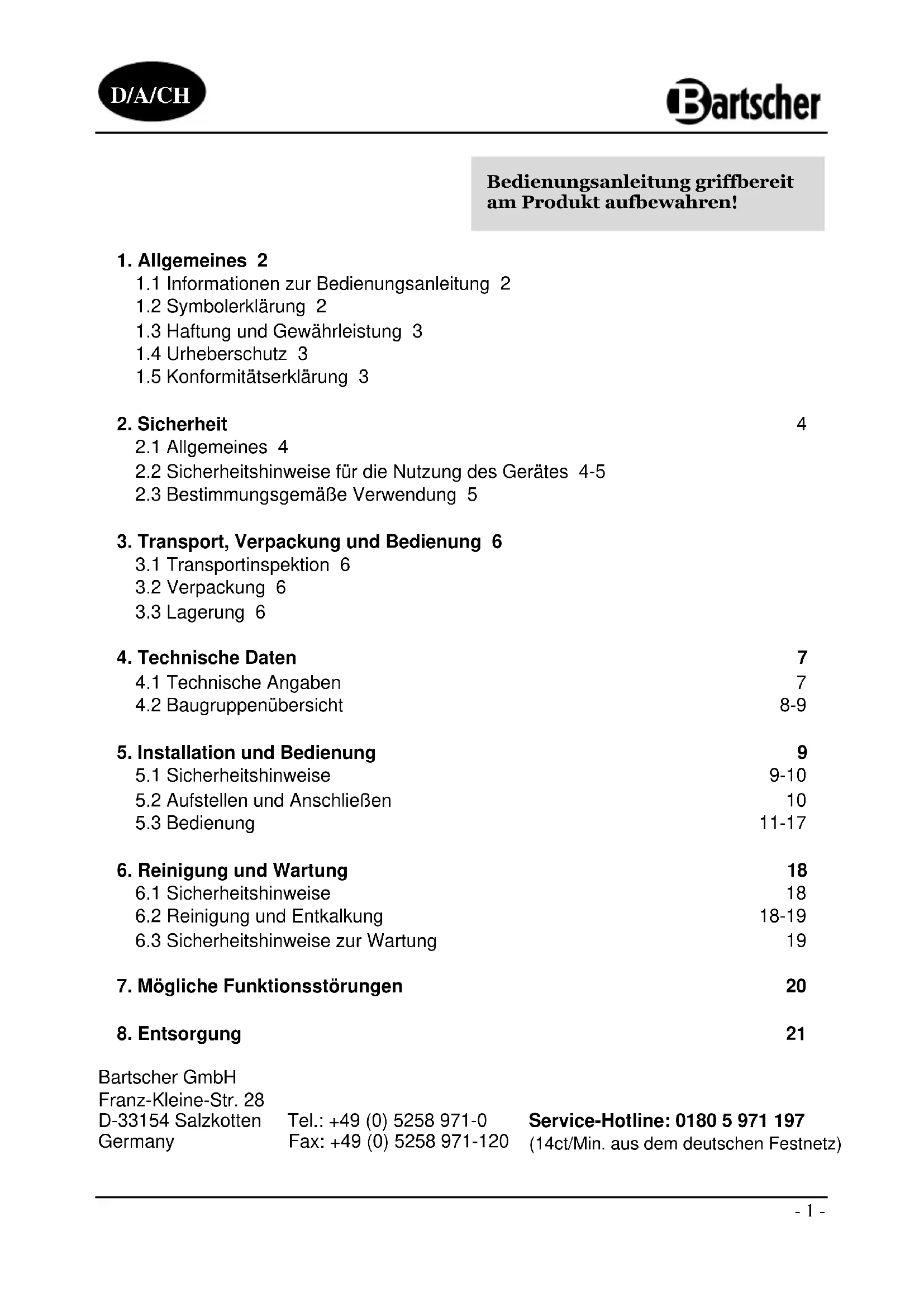 Bartscher GmbH Franz-Kleine-Str. 28 D-33154 Salzkotten Tel.: +49 (0) 5258 971-0 Service-Hotline: 0180 5 971 197 Germany Fax: +49 (0) 5258 971-120 (14ct/Min. aus dem deutschen Festnetz) D/A/CH