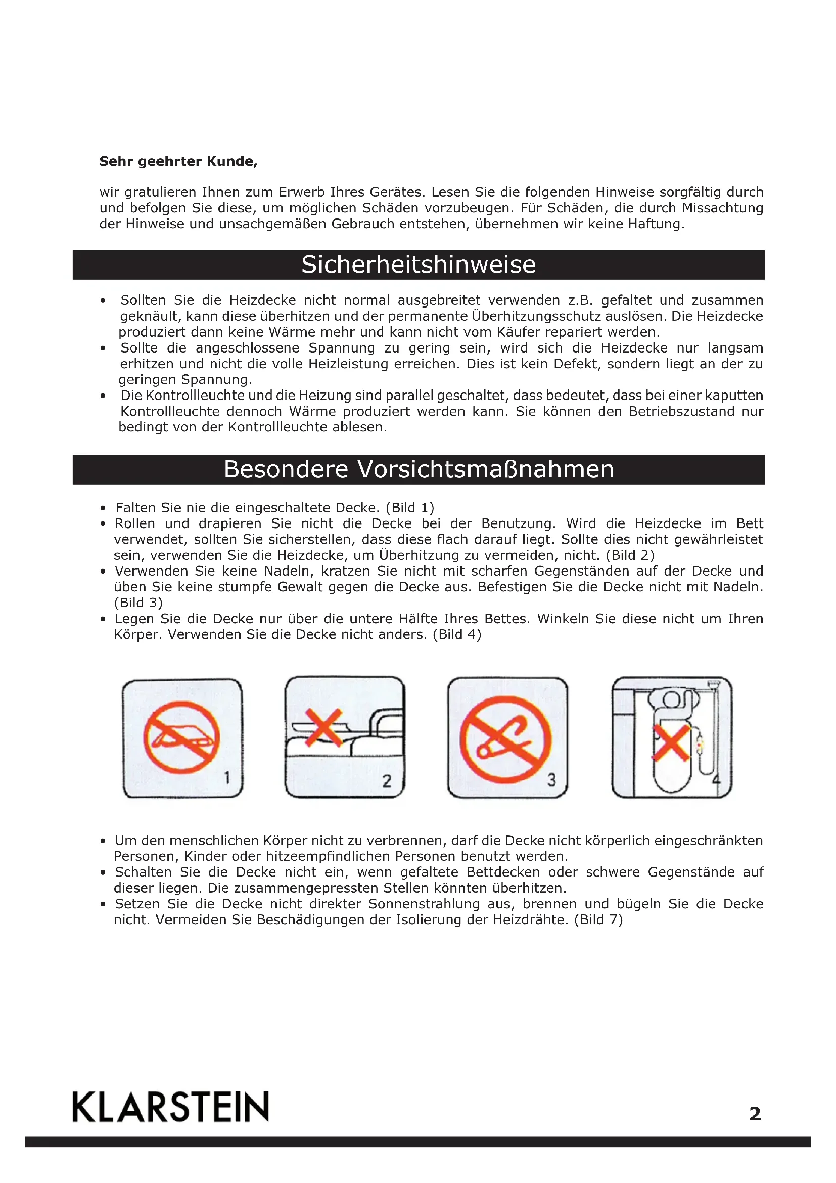 Elektrische HeizdeckeSehr geehrter Kunde, wir gratulieren Ihnen zum Erwerb Ihres Gerätes. Lesen Sie die folgenden Hinweise sorgfältig durch und befolgen Sie diese, um möglichen Schäden vorzubeugen. Für Schäden, die durch Missachtung der Hinweise und unsachgemäßen Gebrauch entstehen, übernehmen wir keine Haftung. Sicherheitshinweise