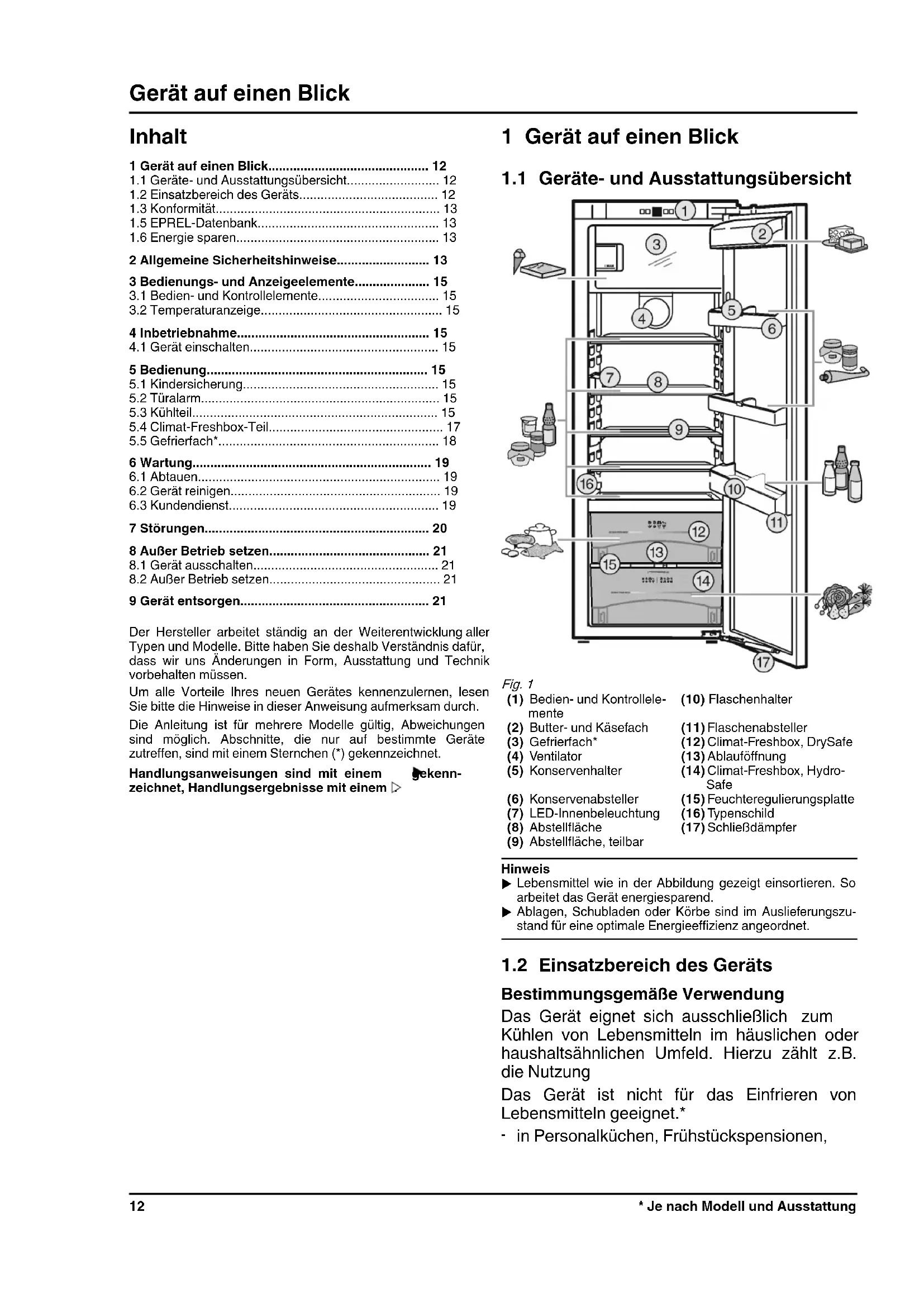 - afhankelijk van model en uitvoering 11Inhalt 1 Gerät auf einen Blick............................................. 121.1 Geräte- und Ausstattungsübersicht.......................... 121.2 Einsatzbereich des Geräts....................................... 121.3 Konformität............................................................... 131.5 EPREL-Datenbank................................................... 131.6 Energie sparen......................................................... 132 Allgemeine Sicherheitshinweise.......................... 133 Bedienungs- und Anzeigeelemente..................... 153.1 Bedien- und Kontrollelemente.................................. 153.2 Temperaturanzeige................................................... 154 Inbetriebnahme...................................................... 154.1 Gerät einschalten..................................................... 155 Bedienung.............................................................. 155.1 Kindersicherung....................................................... 155.2 Türalarm................................................................... 155.3 Kühlteil..................................................................... 155.4 Climat-Freshbox-Teil................................................. 175.5 Gefrierfach*.............................................................. 186 Wartung................................................................... 196.1 Abtauen.................................................................... 196.2 Gerät reinigen........................................................... 196.3 Kundendienst........................................................... 197 Störungen............................................................... 208 Außer Betrieb setzen............................................. 218.1 Gerät ausschalten.................................................... 218.2 Außer Betrieb setzen................................................ 219 Gerät entsorgen..................................................... 21Der Hersteller arbeitet ständig an der Weiterentwicklung allerTypen und Modelle. Bitte haben Sie deshalb Verständnis dafür,dass wir uns Änderungen in Form, Ausstattung und Technikvorbehalten müssen.Um alle Vorteile Ihres neuen Gerätes kennenzulernen, lesenSie bitte die Hinweise in dieser Anweisung aufmerksam durch. Die Anleitung ist für mehrere Modelle gültig, Abweichungen sind möglich. Abschnitte, die nur auf bestimmte Geräte zutreffen, sind mit einem Sternchen (*) gekennzeichnet.Handlungsanweisungen sind mit einem gekenn-zeichnet, Handlungsergebnisse mit einem . 1 Gerät auf einen Blick