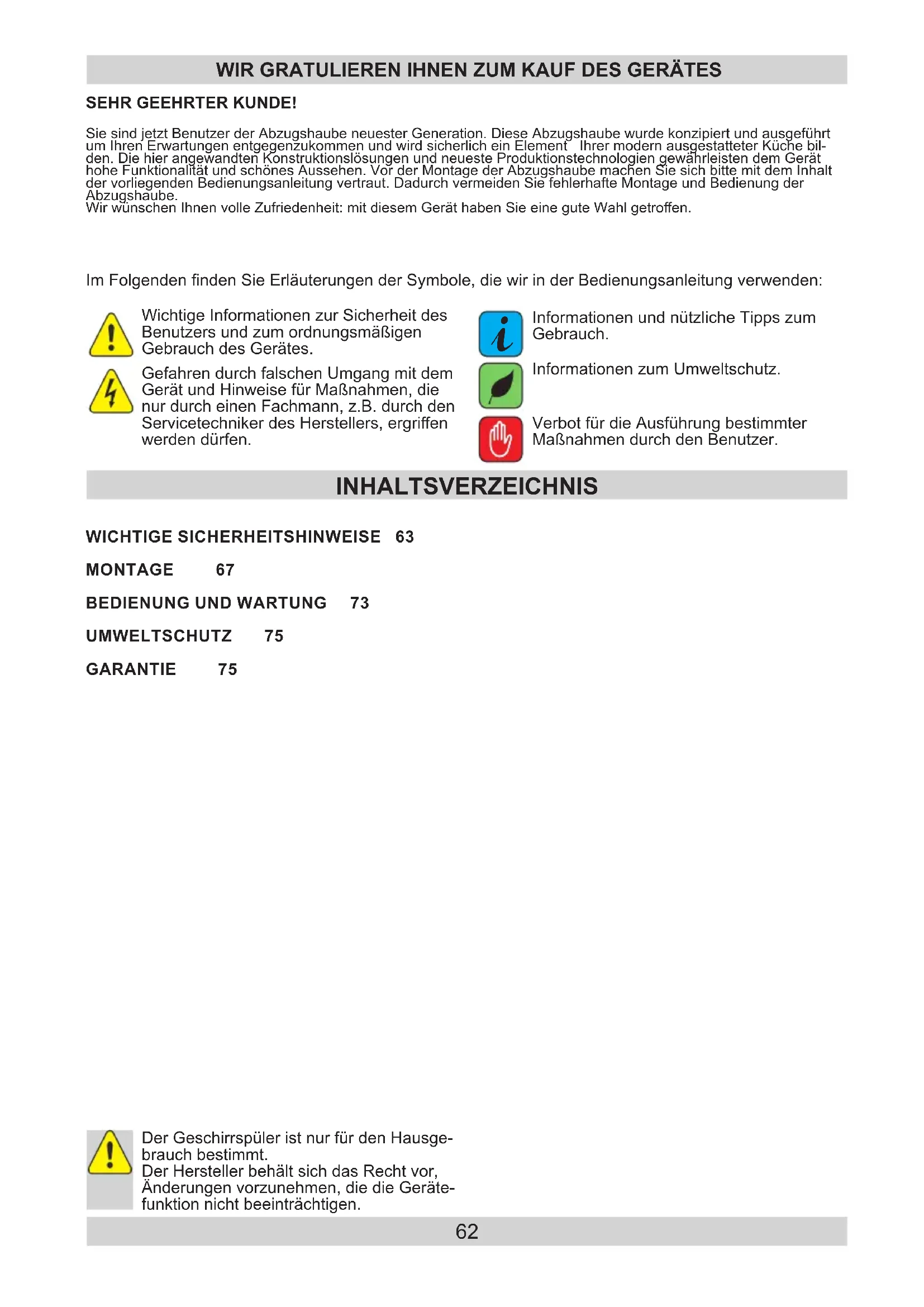 - Directive RoHS 2011/65/EC and has thus been marked with the symbol and been issued with a declaration of compliance made available to market regulators.62 INHALTSVERZEICHNIS SEHR GEEHRTER KUNDE! Sie sind jetzt Benutzer der Abzugshaube neuester Generation. Diese Abzugshaube wurde konzipiert und ausgeführt um Ihren Erwartungen entgegenzukommen und wird sicherlich ein Element Ihrer modern ausgestatteter Küche bil- den. Die hier angewandten Konstruktionslösungen und neueste Produktionstechnologien gewährleisten dem Gerät hohe Funktionalität und schönes Aussehen. Vor der Montage der Abzugshaube machen Sie sich bitte mit dem Inhalt der vorliegenden Bedienungsanleitung vertraut. Dadurch vermeiden Sie fehlerhafte Montage und Bedienung der Abzugshaube.Wir wünschen Ihnen volle Zufriedenheit: mit diesem Gerät haben Sie eine gute Wahl getroen. WIR GRATULIEREN IHNEN ZUM KAUF DES GERÄTES WICHTIGE SICHERHEITSHINWEISE 63 MONTAGE 67