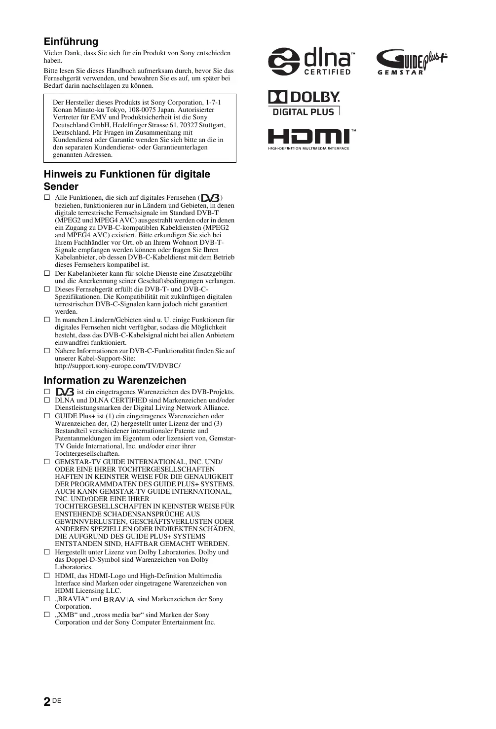 ENTSTANDEN SIND, HAFTBAR GEMACHT WERDEN. s Hergestellt unter Lizenz von Dolby Laboratories. Dolby und das Doppel-D-Symbol sind Warenzeichen von Dolby Laboratories. s HDMI, das HDMI-Logo und High-Definition Multimedia Interface sind Marken oder eingetragene Warenzeichen von HDMI Licensing LLC. s „BRAVIA“ und sind Markenzeichen der Sony Corporation. s „XMB“ und „xross media bar“ sind Marken der Sony Corporation und der Sony Computer Entertainment Inc. 2 DE Inhaltsverzeichnis Leitfaden zur Inbetriebnahme