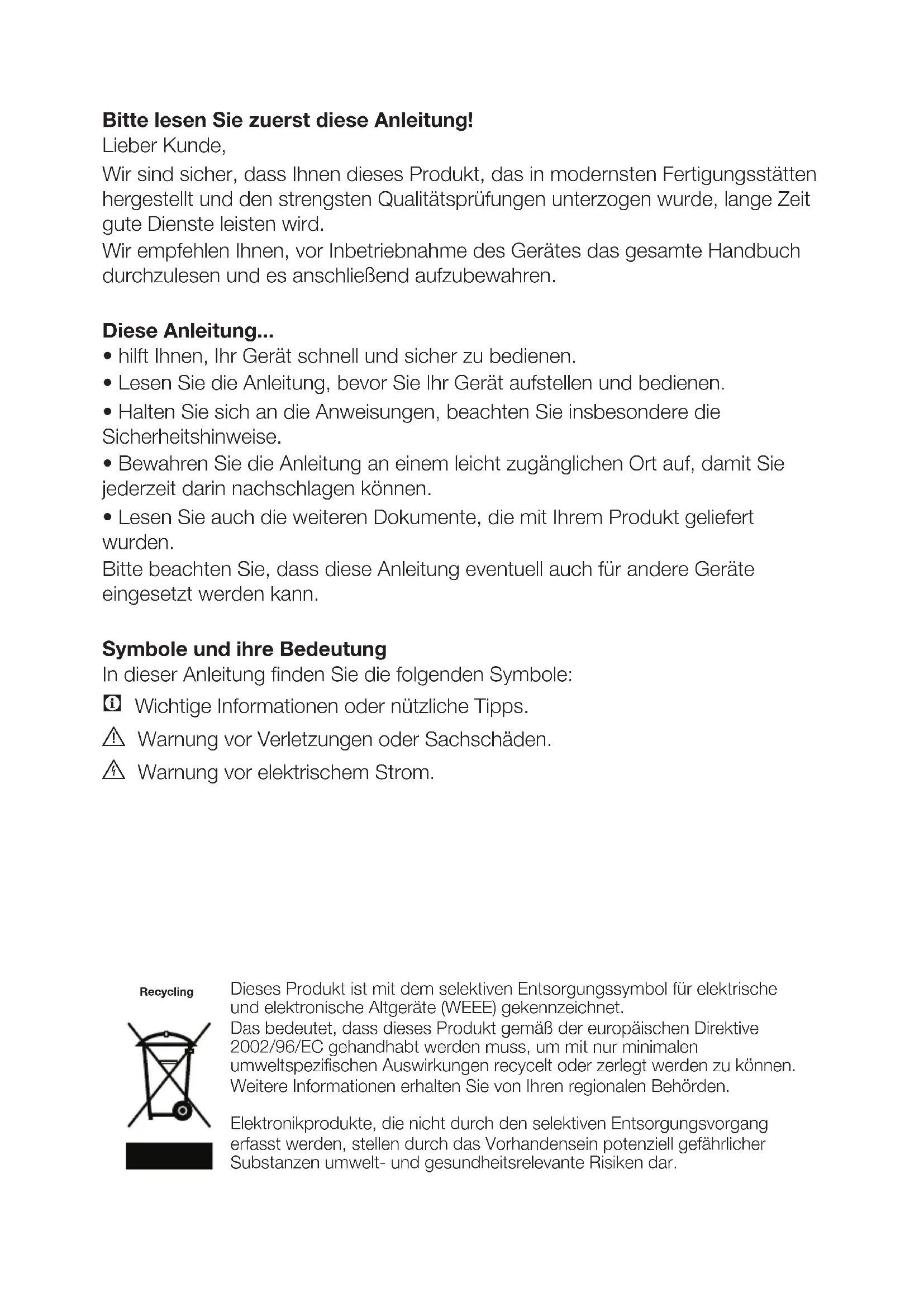 - Lesen Sie auch die weiteren Dokumente, die mit Ihrem Produkt geliefert wurden. Bitte beachten Sie, dass diese Anleitung eventuell auch für andere Geräte eingesetzt werden kann. Symbole und ihre Bedeutung In dieser Anleitung finden Sie die folgenden Symbole: C Wichtige Informationen oder nützliche Tipps. A Warnung vor Verletzungen oder Sachschäden. B Warnung vor elektrischem Strom. Dieses Produkt ist mit dem selektiven Entsorgungssymbol für elektrische und elektronische Altgeräte (WEEE) gekennzeichnet. Das bedeutet, dass dieses Produkt gemäß der europäischen Direktive 2002/96/EC gehandhabt werden muss, um mit nur minimalen umweltspezifischen Auswirkungen recycelt oder zerlegt werden zu können. Weitere Informationen erhalten Sie von Ihren regionalen Behörden. Elektronikprodukte, die nicht durch den selektiven Entsorgungsvorgang erfasst werden, stellen durch das Vorhandensein potenziell gefährlicher Substanzen umwelt- und gesundheitsrelevante Risiken dar. RecyclingDE