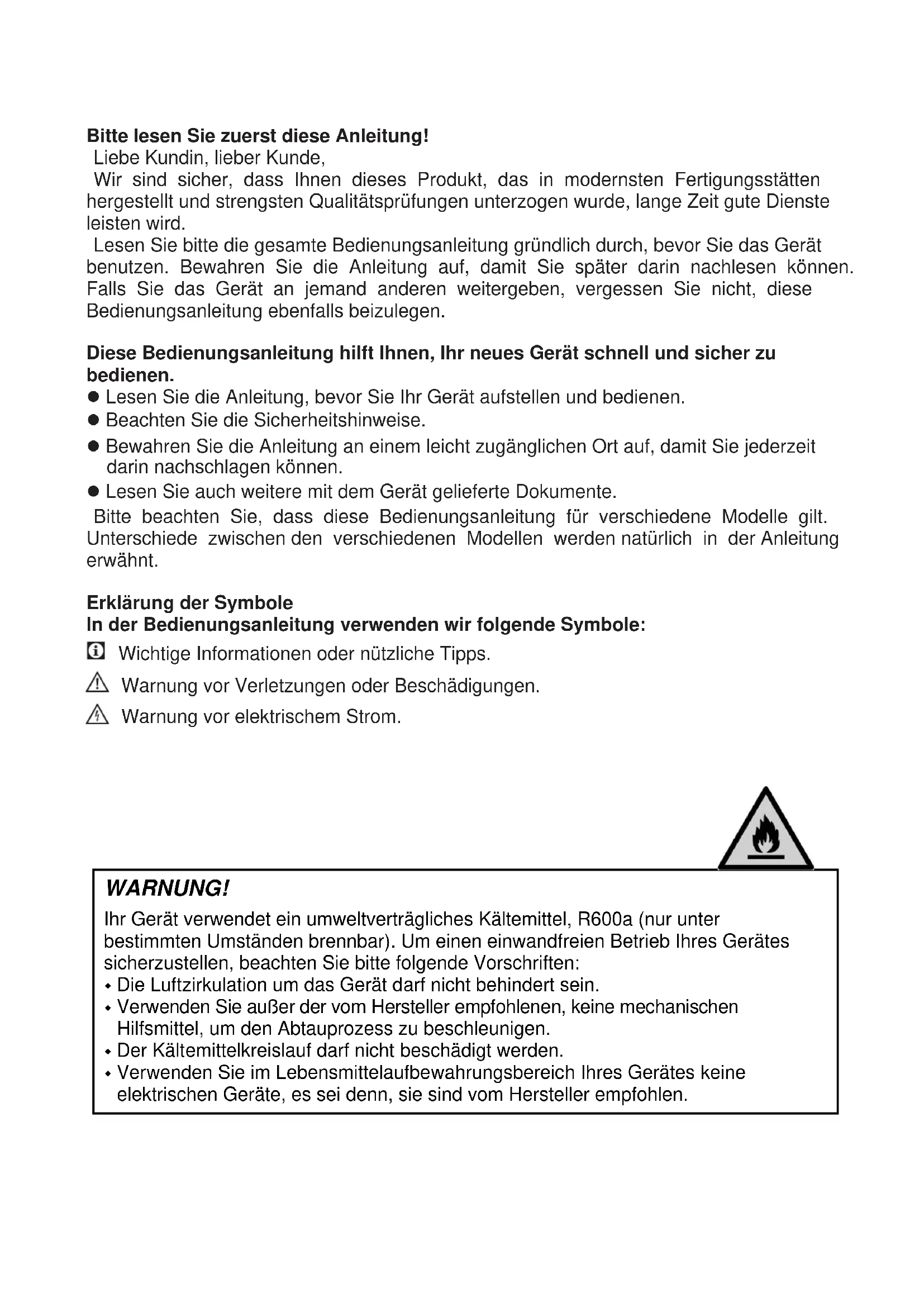 - The food is touching the ceiling of the drawer. >>>Rearrange food in the drawer.Bitte lesen Sie zuerst diese Anleitung! Liebe Kundin, lieber Kunde, Wir sind sicher, dass Ihnen dieses Produkt, das in modernsten Fertigungsstätten hergestellt und strengsten Qualitätsprüfungen unterzogen wurde, lange Zeit gute Dienste leisten wird. Lesen Sie bitte die gesamte Bedienungsanleitung gründlich durch, bevor Sie das Gerät benutzen. Bewahren Sie die Anleitung auf, damit Sie später darin nachlesen können. Falls Sie das Gerät an jemand anderen weitergeben, vergessen Sie nicht, diese Bedienungsanleitung ebenfalls beizulegen. Diese Bedienungsanleitung hilft Ihnen, Ihr neues Gerät schnell und sicher zu bedienen. Lesen Sie die Anleitung, bevor Sie Ihr Gerät aufstellen und bedienen. Beachten Sie die Sicherheitshinweise. Bewahren Sie die Anleitung an einem leicht zugänglichen Ort auf, damit Sie jederzeit darin nachschlagen können. Lesen Sie auch weitere mit dem Gerät gelieferte Dokumente. Bitte beachten Sie, dass diese Bedienungsanleitung für verschiedene Modelle gilt. Unterschiede zwischen den verschiedenen Modellen werden natürlich in der Anleitung erwähnt. Erklärung der Symbole In der Bedienungsanleitung verwenden wir folgende Symbole: Wichtige Informationen oder nützliche Tipps. Warnung vor Verletzungen oder Beschädigungen. Warnung vor elektrischem Strom. WARNUNG! Ihr Gerät verwendet ein umweltverträgliches Kältemittel, R600a (nur unter bestimmten Umständen brennbar). Um einen einwandfreien Betrieb Ihres Gerätes sicherzustellen, beachten Sie bitte folgende Vorschriften: Die Luftzirkulation um das Gerät darf nicht behindert sein. Verwenden Sie außer der vom Hersteller empfohlenen, keine mechanischen Hilfsmittel, um den Abtauprozess zu beschleunigen. Der Kältemittelkreislauf darf nicht beschädigt werden. Verwenden Sie im Lebensmittelaufbewahrungsbereich Ihres Gerätes keine elektrischen Geräte, es sei denn, sie sind vom Hersteller empfohlen.1 Ihr Kühlschrank 3 2 Wichtige Hinweise zu Ihrer Sicherheit 4 Bestimmungsgemäßer Einsatz......... 4 Allgemeine Hinweise zu Ihrer Sicherheit ................................. 4 Bei Geräten mit einem Wasserspender ................................ 6 Sicherheit von Kindern ..................... 6 Konformität mit der WEEE-Richtlinie zur Entsorgung von Altgeräten ......... 6 Hinweise zur Verpackung ................. 7 Wichtige Hinweise zum Kältemittel... 7 Tipps zum Energiesparen................. 7 3 Installation 8 Wenn Sie den Kühlschrank versetzen möchten ............................................ 8 Vor dem Einschalten ........................ 8 Elektrischer Anschluss ..................... 8 Verpackungsmaterialien entsorgen .. 8 Altgeräte entsorgen .......................... 9 Aufstellung und Installation............... 9 Beleuchtung auswechseln ................ 9 Wechseln des Türanschlags ............ 9 Füße einstellen ................................. 9 INHALT 2 D 4 Vorbereitung 10 5 So nutzen Sie Ihren Kühlschrank 11 Anzeigetafeld .................................. 11 Doppeltes Kühlsystem .................... 13 So benutzen Sie den Frische Lebensmittel tiefkühlen ...... 14 Empfehlungen zur Konservierung gefrorener Lebensmittel .................. 15 Abtauen........................................... 15 Lebensmittel platzieren ................... 15 Informationen zum Tiefkühlen ........ 16 Empfehlungen zum Kühlbereich (für frische Lebensmittel) ....................... 16 6 Reinigung und Pflege 17 Kunststoffflächen schützen ............. 17 7 Problemlösung 18Ihr Kühlschrank