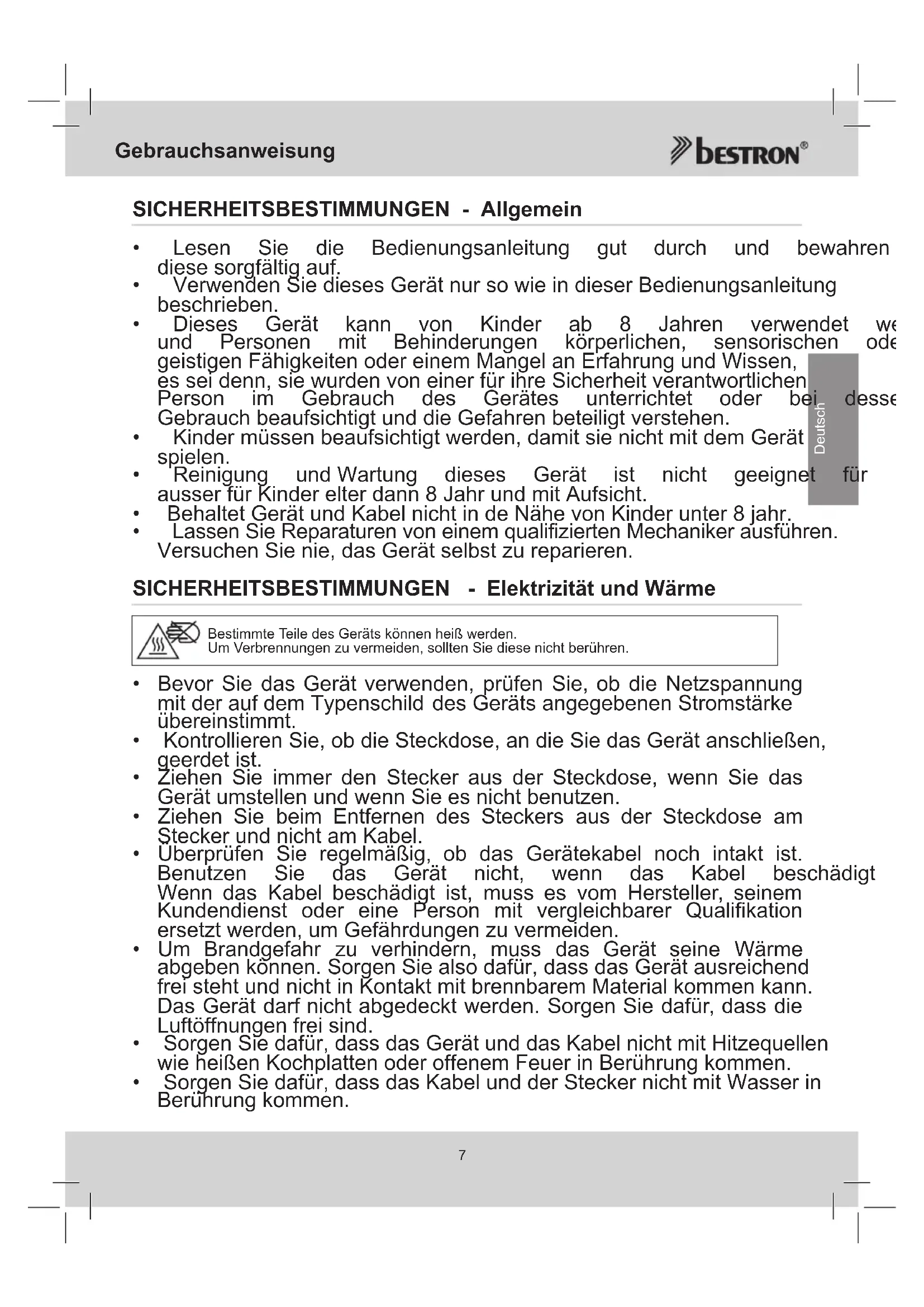 aufErstattungeineseventuellenSchadensein.DerImporteurkanninkeinemFallfüreventuelle FolgeschädenoderirgendwelcheanderenFolgenhaftbargemachtwerden,diedurchdasvonihm gelieferteoderinVerbindungmitdemvonihmgeliefertenGerätentstandensind. 10.UmGarantieleistungeninAnspruchzunehmen,wendenSiesichtdirektanIhrenHändler.Bestron bietetauchdieMöglichkeitdirektmitdemWerkskundendienstabzuwickeln.Voraussetzunghierfür ist,dassSiesichzunächsttelefonisch,perFaxoderMailandenWerkskundendienstwenden.Bitte schickenSiekeineGeräteunaufgefordert.InsbesonderedürfenPaketeniemalsunfreieingesendet werden.SprechenSiedaherzuerstmituns.WirsagenIhnenwieSieIhrGerätanunseinsenden sollen. 11.DasGeräteignetsichnichtfürdieprofessionelleVerwendung. KUNDENDIENST SollteunerwarteteineStörungauftretendannkönnenSiesichmitdemBESTRON-Kundendienstin Verbindungsetzen:www.bestron.com/service