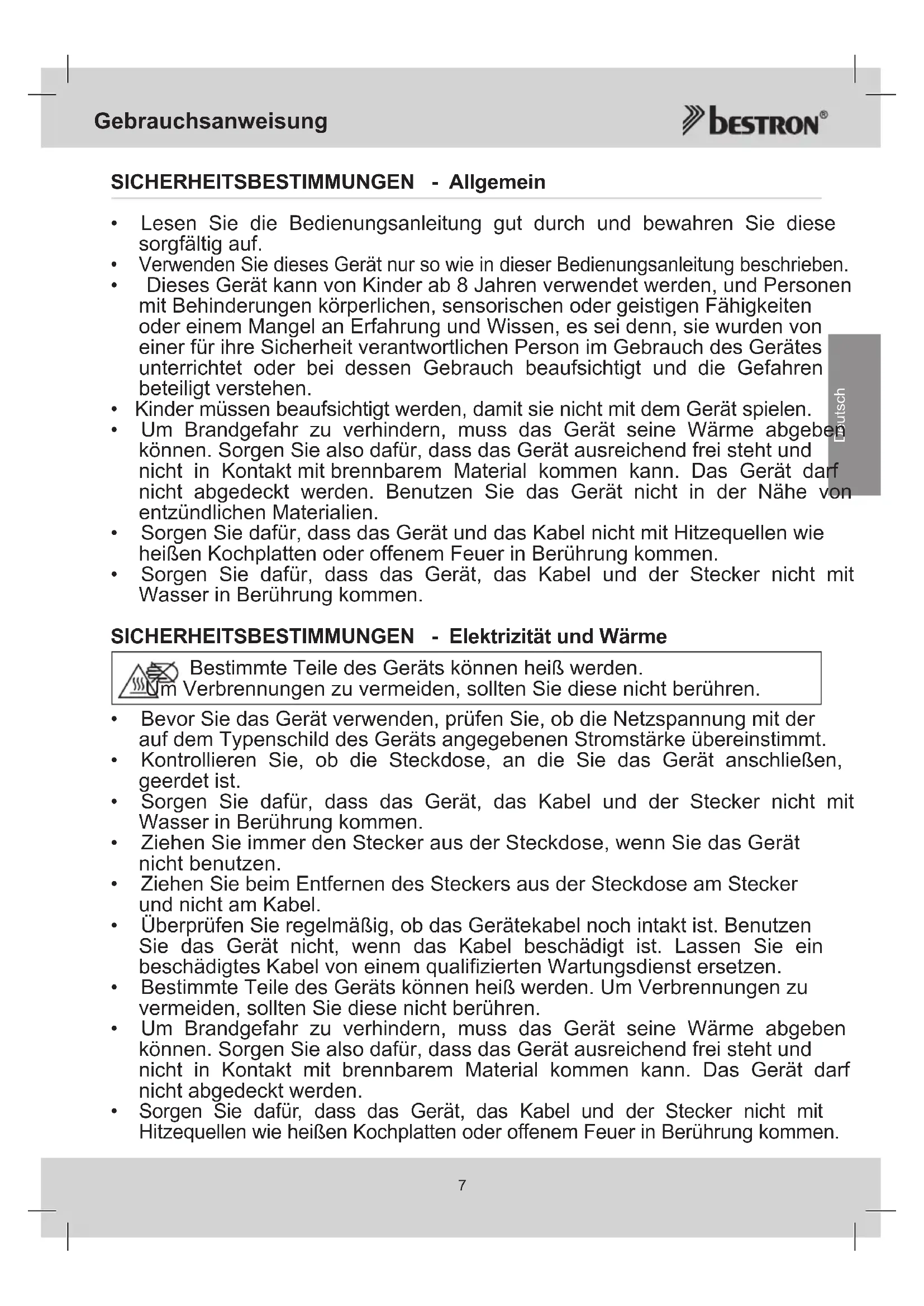 - Sorgen Sie dafür, dass das Gerät, das Kabel und der Stecker nicht mit Wasser in Berührung kommen. SICHERHEITSBESTIMMUNGEN - Elektrizität und Wärme Bestimmte Teile des Geräts können heiß werden. Um Verbrennungen zu vermeiden, sollten Sie diese nicht berühren.