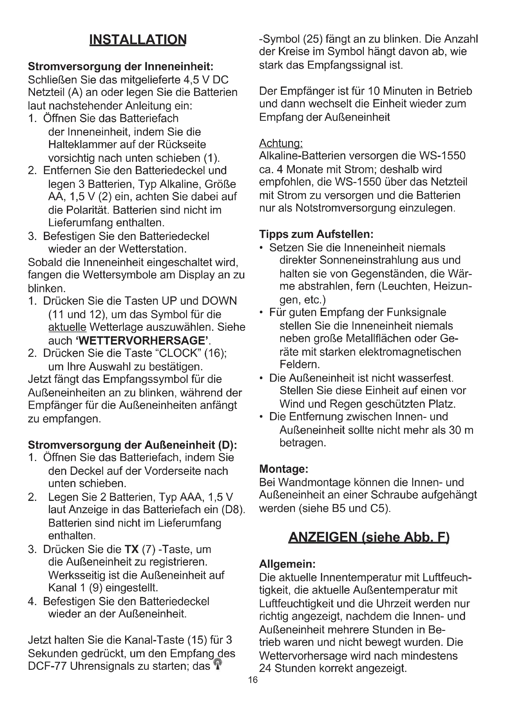 wieder an der Außeneinheit. Jetzt halten Sie die Kanal-Taste (15) für 3 Sekunden gedrückt, um den Empfang des DCF-77 Uhrensignals zu starten; das -Symbol (25) fängt an zu blinken. Die Anzahl der Kreise im Symbol hängt davon ab, wie stark das Empfangssignal ist. Der Empfänger ist für 10 Minuten in Betrieb und dann wechselt die Einheit wieder zum Empfang der Außeneinheit Achtung: Alkaline-Batterien versorgen die WS-1550 ca. 4 Monate mit Strom; deshalb wird empfohlen, die WS-1550 über das Netzteil mit Strom zu versorgen und die Batterien nur als Notstromversorgung einzulegen. Tipps zum Aufstellen: