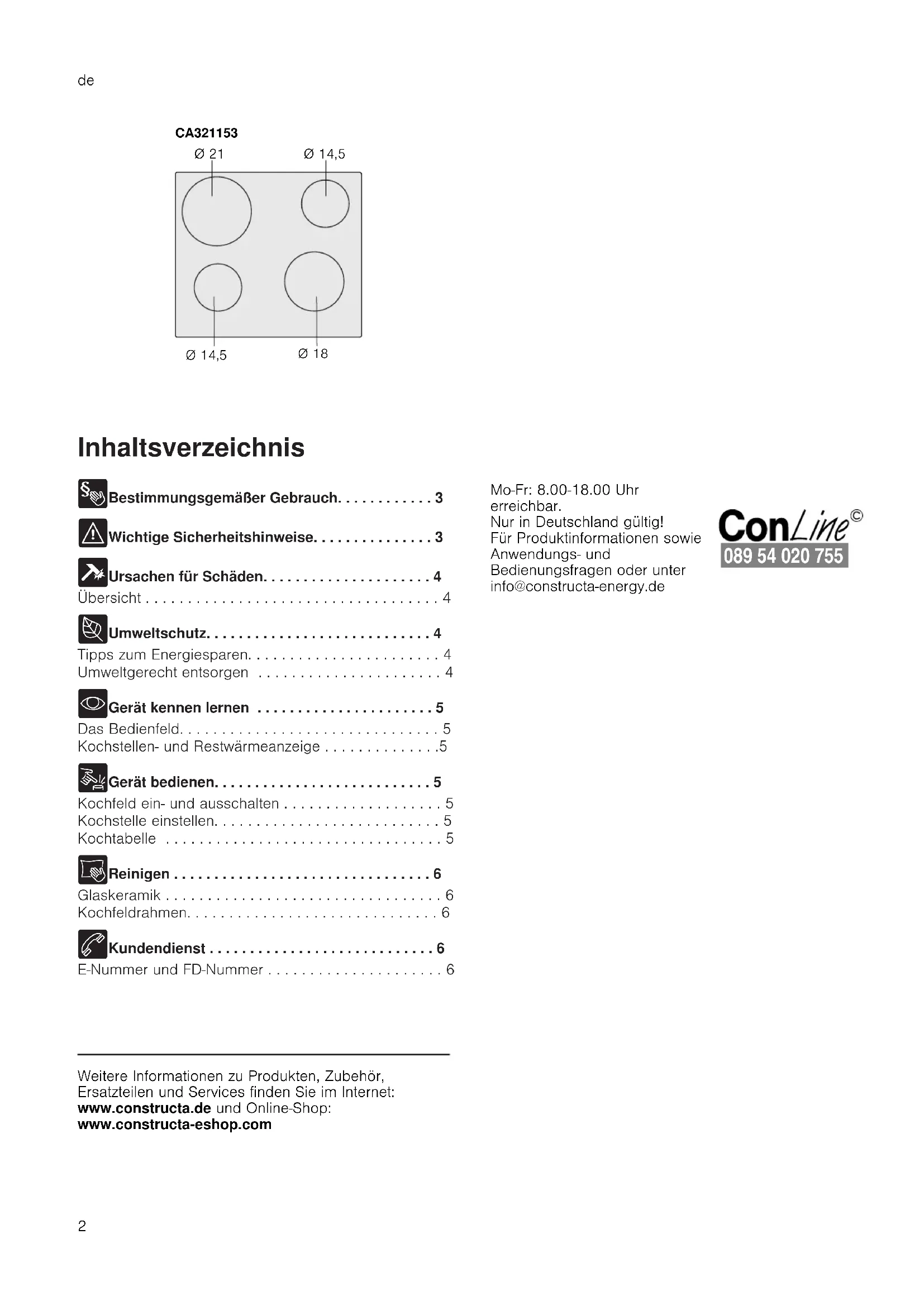 - Gerät kennen lernen . . . . . . . . . . . . . . . . . . . . . . 5 Das Bedienfeld. . . . . . . . . . . . . . . . . . . . . . . . . . . . . . . 5 Kochstellen- und Restwärmeanzeige . . . . . . . . . . . . . .5 1 Gerät bedienen. . . . . . . . . . . . . . . . . . . . . . . . . . . 5 Kochfeld ein- und ausschalten . . . . . . . . . . . . . . . . . . . 5 Kochstelle einstellen. . . . . . . . . . . . . . . . . . . . . . . . . . . 5 Kochtabelle . . . . . . . . . . . . . . . . . . . . . . . . . . . . . . . . . 5 D Reinigen . . . . . . . . . . . . . . . . . . . . . . . . . . . . . . . . 6 Glaskeramik . . . . . . . . . . . . . . . . . . . . . . . . . . . . . . . . . 6 Kochfeldrahmen. . . . . . . . . . . . . . . . . . . . . . . . . . . . . . 6 4 Kundendienst . . . . . . . . . . . . . . . . . . . . . . . . . . . . 6 E-Nummer und FD-Nummer . . . . . . . . . . . . . . . . . . . . . 6 Produktinfo Weitere Informationen zu Produkten, Zubehör, Ersatzteilen und Services finden Sie im Internet: www.constructa.de und Online-Shop: www.constructa-eshop.com Mo-Fr: 8.00-18.00 Uhr erreichbar. Nur in Deutschland gültig! Für Produktinformationen sowie Anwendungs- und Bedienungsfragen oder unter info@constructa-energy.de