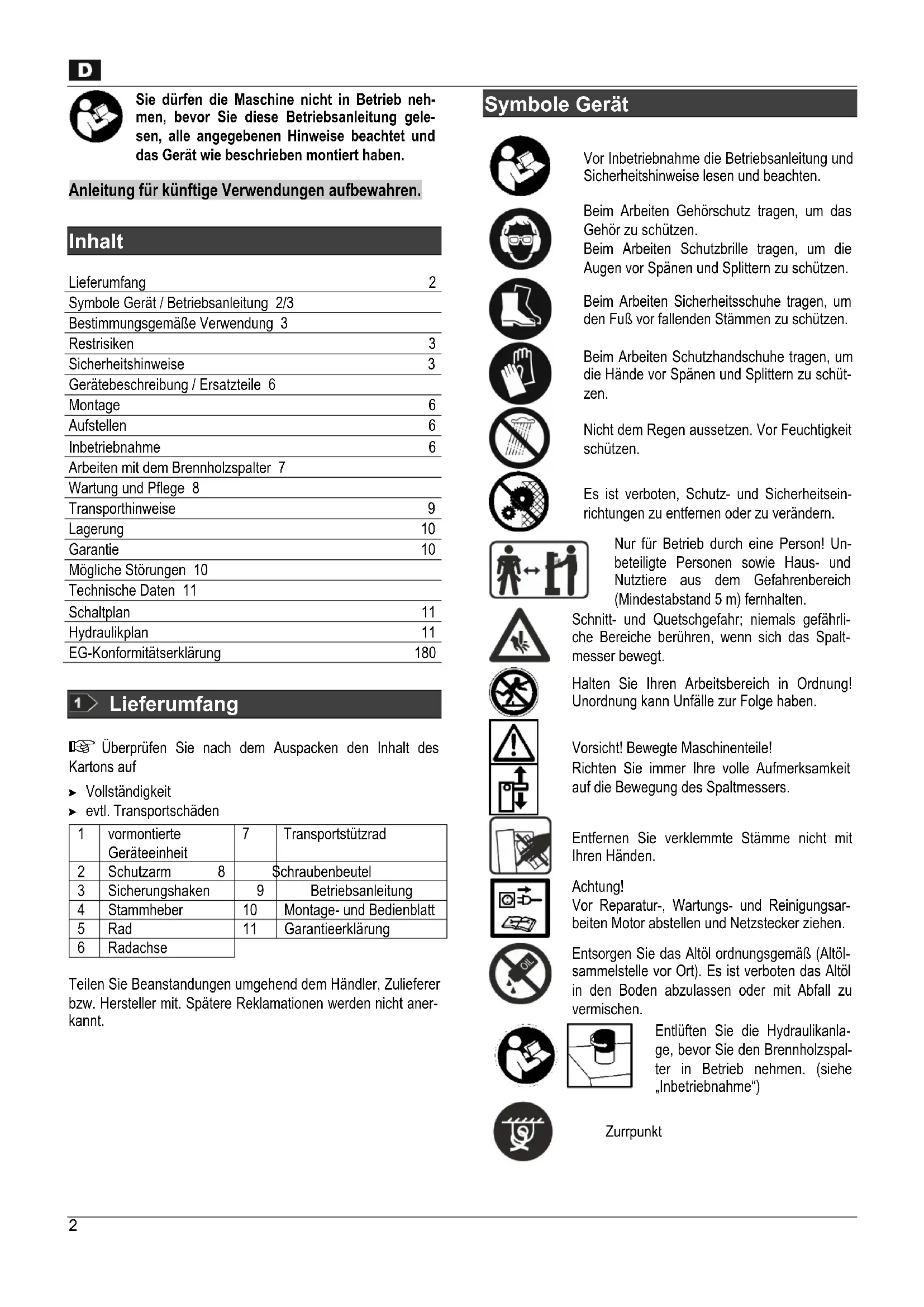 Inhalt Lieferumfang 2 Symbole Gerät / Betriebsanleitung 2/3 Bestimmungsgemäße Verwendung 3 Restrisiken 3 Sicherheitshinweise 3 Gerätebeschreibung / Ersatzteile 6 Montage 6 Aufstellen 6 Inbetriebnahme 6 Arbeiten mit dem Brennholzspalter 7 Wartung und Pflege 8 Transporthinweise 9 Lagerung 10 Garantie 10 Mögliche Störungen 10 Technische Daten 11 Schaltplan 11 Hydraulikplan 11 EG-Konformitätserklärung 180