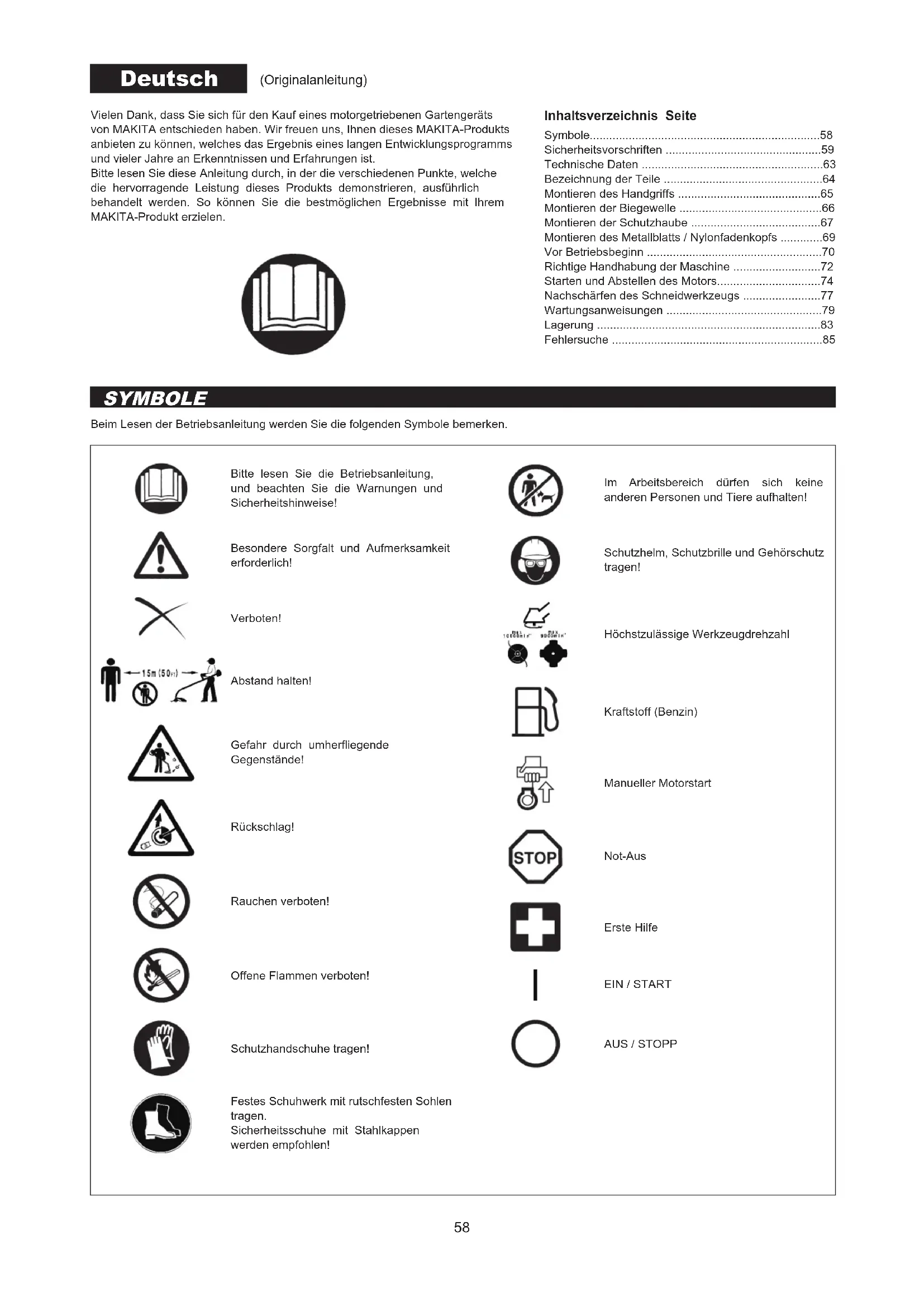 - Avant d’envoyer votre appareil en réparation, vériez si vous pouvez régler le problème vous-même. Si vous découvrez une anomalie, commandez votre appareil selon les descriptions de ce manuel. Ne démontez et ne modiez aucune pièce d’une manière contraire à la description. Pour toute réparation, contactez un agent d’entretien agréé ou un revendeur local. Problème Cause probable (dysfonctionnement) Solution Le moteur ne démarre pas. L’interrupteur I-O est en position STOP (ARRÊT). Réglez l’interrupteur I-O sur FONCTIONNEMENT. Oubli d’activation de la pompe d’amorçage. Appuyer 7 à 10 fois. Tirage lent de la corde du démarreur. Tirer plus fort. Panne de carburant. Faire le plein. Filtre à carburant bouché. Nettoyer. Tube de carburant plié. Redresser le tuyau de carburant. Carburant détérioré. Du carburant détérioré rend le démarrage plus difcile. Remplacez-le par du carburant neuf. (Remplacement recommandé : 1 fois par mois) Aspiration excessive du carburant. Réglez le levier d’accélérateur de la vitesse moyenne à la vitesse élevée et tirez sur la poignée de démarrage jusqu’à ce que le moteur démarre. Lorsque le moteur démarre, l’outil de coupe commence à tourner. Faites très attention à l’outil de coupe. Si le moteur ne démarre toujours pas, retirez la bougie, séchez l’électrode et ré-assemblez ces éléments comme ils l’étaient à l’origine. Ensuite, démarrez comme indiqué. Protecteur de bougie débranché. Le brancher solidement. Bougie contaminée. Nettoyer. Espacement anormal de la bougie. Régler l’espacement. Autre problème de la bougie. Remplacer. Carburateur anormal. Faire une demande d’examen et d’entretien. Impossible de tirer la corde de démarrage. Faire une demande d’examen et d’entretien. Entraînement anormal. Faire une demande d’examen et d’entretien. Le moteur s’arrête rapidement. La vitesse du moteur n’augmente pas. Réchauffement insufsant. Réchauffer le moteur. Le levier d’étrangleur est en position « FERMER » alors que le moteur est chaud. Réglez-le sur « OUVRIR ». Filtre à carburant bouché. Nettoyer. Filtre à air contaminé ou bouché. Nettoyer. Carburateur anormal. Faire une demande d’examen et d’entretien. Entraînement anormal. Faire une demande d’examen et d’entretien. Pas de rotation de la lame métallique. Arrêter immédiatement le moteur. Écrou de serrage de la lame métallique desserrée. Le serrer correctement. Branche attrapée par la lame métallique ou le couvercle anti-dispersion. Retirer le corps étranger. Entraînement anormal. Faire une demande d’examen et d’entretien. Vibrations anormales de la machine. Arrêter immédiatement le moteur. Lame métallique cassée, tordue ou émoussée. Remplacer la lame métallique. Écrou de serrage de la lame métallique desserrée. Le serrer correctement. Décalage de la partie convexe de la lame métallique et de son support. Le brancher solidement. Entraînement anormal. Faire une demande d’examen et d’entretien. La lame métallique ne s’arrête pas immédiatement. Arrêter immédiatement le moteur. Rotation élevée au ralenti. Régler. Câble de l’accélérateur débranché. Le brancher solidement. Entraînement anormal. Faire une demande d’examen et d’entretien. Le moteur ne s’arrête pas. Faites tourner le moteur au ralenti et réglez le levier d’étrangleur sur « FERMER ». Connecteur débranché. Le brancher solidement. Système électrique anormal. Faire une demande d’examen et d’entretien.58 Vielen Dank, dass Sie sich für den Kauf eines motorgetriebenen Gartengeräts von MAKITA entschieden haben. Wir freuen uns, Ihnen dieses MAKITA-Produkts anbieten zu können, welches das Ergebnis eines langen Entwicklungsprogramms und vieler Jahre an Erkenntnissen und Erfahrungen ist.Bitte lesen Sie diese Anleitung durch, in der die verschiedenen Punkte, welche die hervorragende Leistung dieses Produkts demonstrieren, ausführlich behandelt werden. So können Sie die bestmöglichen Ergebnisse mit Ihrem MAKITA-Produkt erzielen. Inhaltsverzeichnis Seite Beim Lesen der Betriebsanleitung werden Sie die folgenden Symbole bemerken. SYMBOLE Deutsch (Originalanleitung) Symbole p. 58