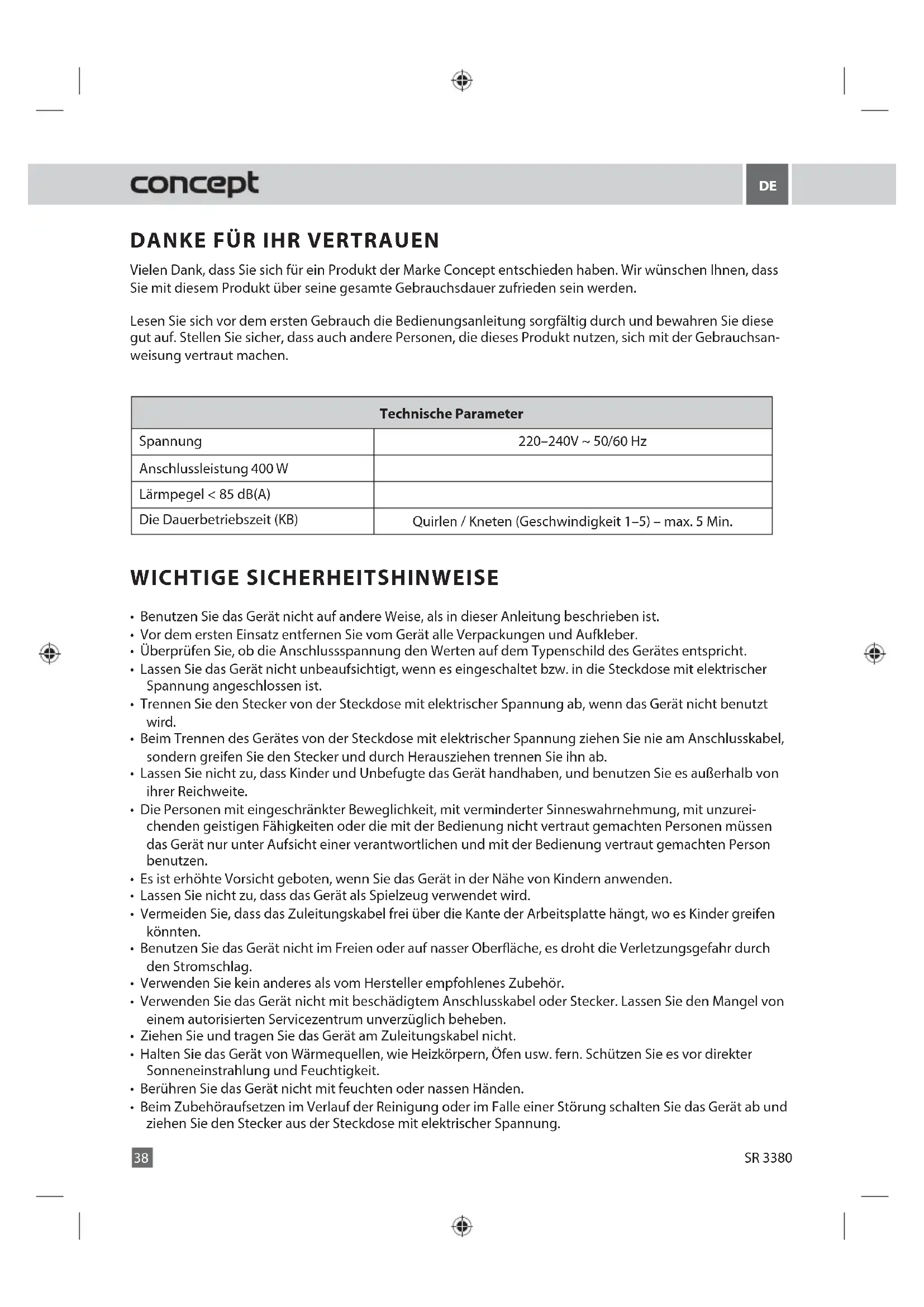SR 3380 Problem Cause SolutionDANKE FÜR IHR VERTRAUEN Vielen Dank, dass Sie sich für ein Produkt der Marke Concept entschieden haben. Wir wünschen Ihnen, dass Sie mit diesem Produkt über seine gesamte Gebrauchsdauer zufrieden sein werden. Lesen Sie sich vor dem ersten Gebrauch die Bedienungsanleitung sorgfältig durch und bewahren Sie diese gut auf. Stellen Sie sicher, dass auch andere Personen, die dieses Produkt nutzen, sich mit der Gebrauchsan- weisung vertraut machen. Technische Parameter Spannung 220–240V ~ 50 /60 Hz Anschlussleistung 400 W Lärmpegel < 85 dB(A) Die Dauerbetriebszeit (KB) Quirlen / Kneten (Geschwindigkeit 1–5) – max. 5 Min. WICHTIGE SICHERHEITSHINWEISE