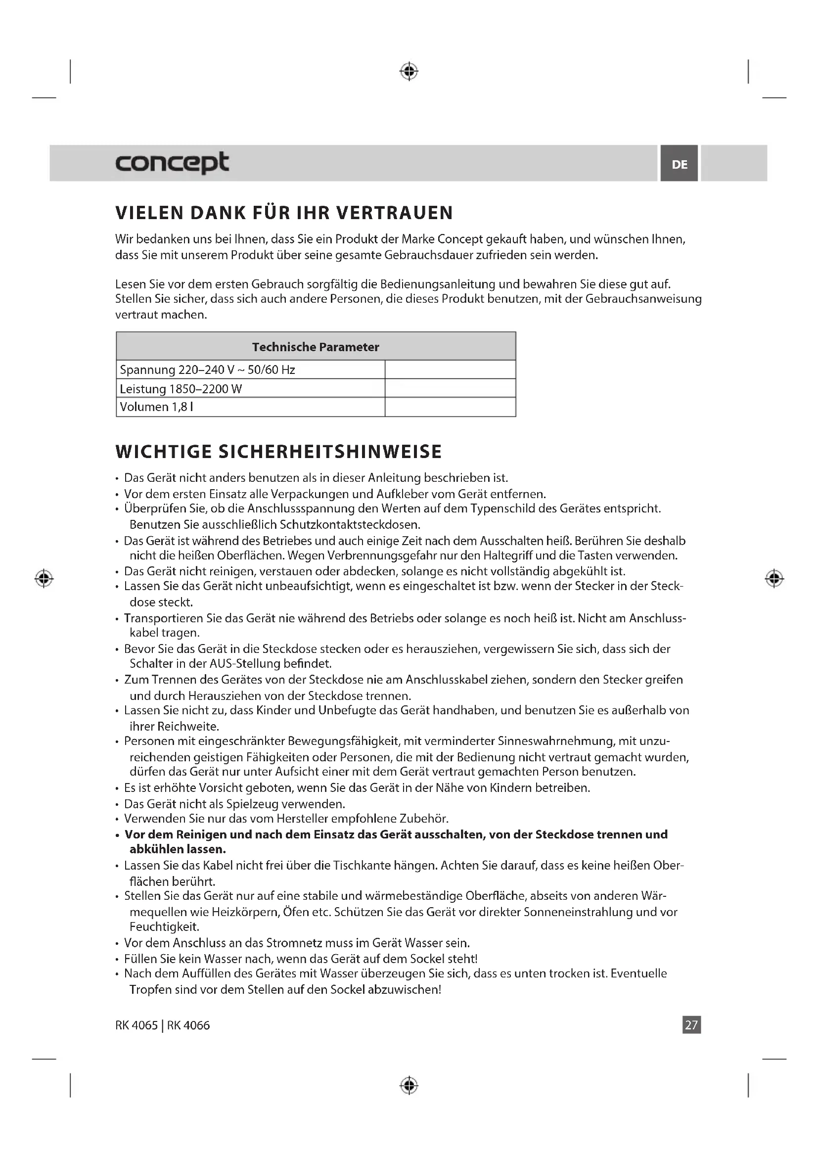 This product meets all the basic EU regulation requirements that relate to it. Changes to the text, design and technical speci cations may occur without prior notice and we reserve the right to make these changes. RK 4065 | RK 4066VIELEN DANK FÜR IHR VERTRAUEN Wir bedanken uns bei Ihnen, dass Sie ein Produkt der Marke Concept gekauft haben, und wünschen Ihnen, dass Sie mit unserem Produkt über seine gesamte Gebrauchsdauer zufrieden sein werden. Lesen Sie vor dem ersten Gebrauch sorgfältig die Bedienungsanleitung und bewahren Sie diese gut auf. Stellen Sie sicher, dass sich auch andere Personen, die dieses Produkt benutzen, mit der Gebrauchsanweisung vertraut machen. Technische Parameter Spannung 220–240 V ~ 50/60 Hz Leistung 1850–2200 W Volumen 1,8 l WICHTIGE SICHERHEITSHINWEISE