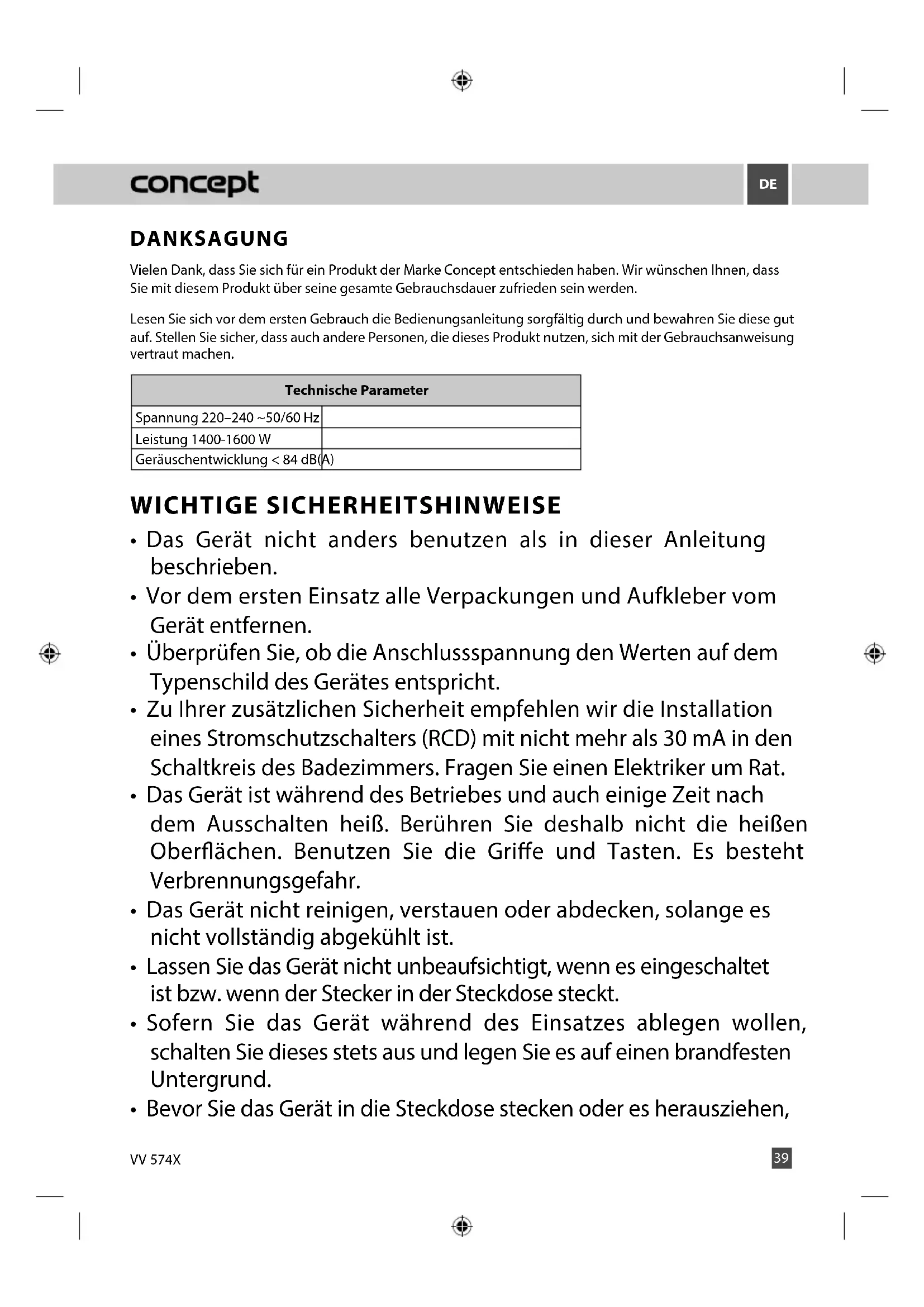 VV 574XDANKSAGUNG Vielen Dank, dass Sie sich für ein Produkt der Marke Concept entschieden haben. Wir wünschen Ihnen, dass Sie mit diesem Produkt über seine gesamte Gebrauchsdauer zufrieden sein werden. Lesen Sie sich vor dem ersten Gebrauch die Bedienungsanleitung sorgfältig durch und bewahren Sie diese gut auf. Stellen Sie sicher, dass auch andere Personen, die dieses Produkt nutzen, sich mit der Gebrauchsanweisung vertraut machen. Technische Parameter Spannung 220–240 ~50/60 Hz Leistung 1400-1600 W Geräuschentwicklung < 84 dB(A) WICHTIGE SICHERHEITSHINWEISE