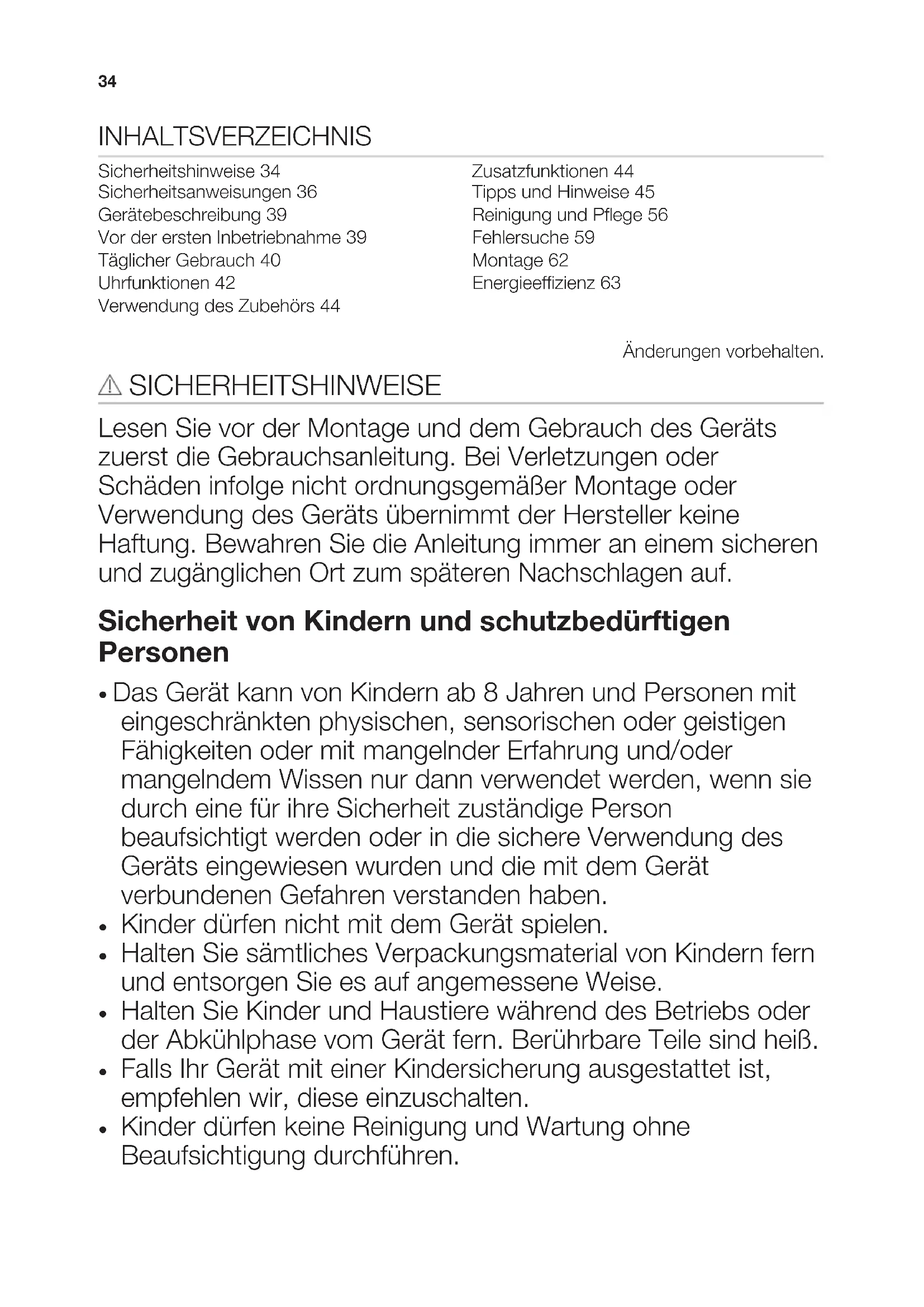 Kinder dürfen keine Reinigung und Wartung ohne Beaufsichtigung durchführen. 34• Kinder bis zu 3 Jahren sind während des Betriebs unbedingt von dem Gerät fernzuhalten. Allgemeine Sicherheit