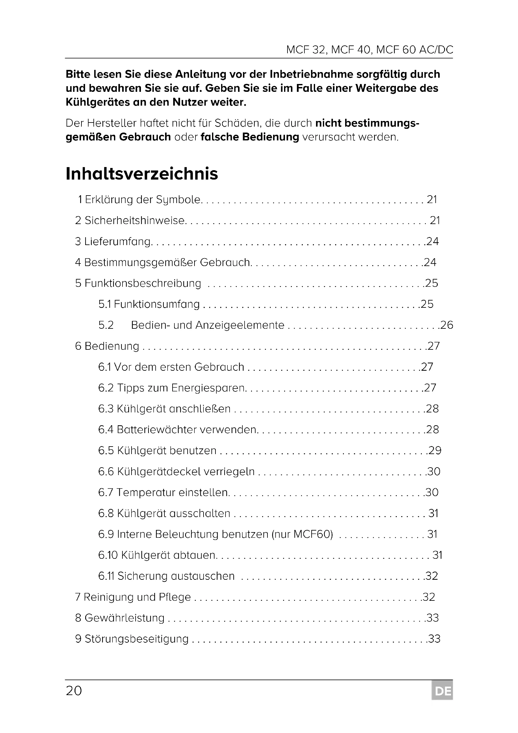 - Bitte lesen Sie diese Anleitung vor der Inbetriebnahme sorgfältig durch und bewahren Sie sie auf. Geben Sie sie im Falle einer Weitergabe des Kühlgerätes an den Nutzer weiter. Der Hersteller haftet nicht für Schäden, die durch nicht bestimmungs- gemäßen Gebrauch oder falsche Bedienung verursacht werden. Inhaltsverzeichnis 1 Erklärung der Symbole p. 21