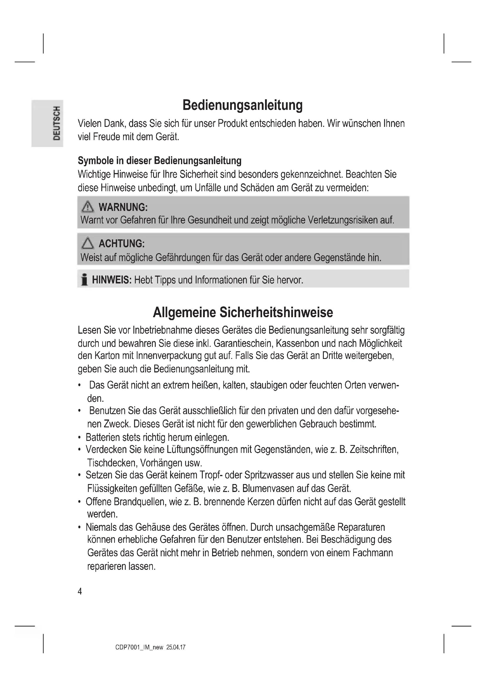 - Niemals das Gehäuse des Gerätes öffnen. Durch unsachgemäße Reparaturen können erhebliche Gefahren für den Benutzer entstehen. Bei Beschädigung des Gerätes das Gerät nicht mehr in Betrieb nehmen, sondern von einem Fachmann reparieren lassen.CDP7001_IM_new 25.04.17
