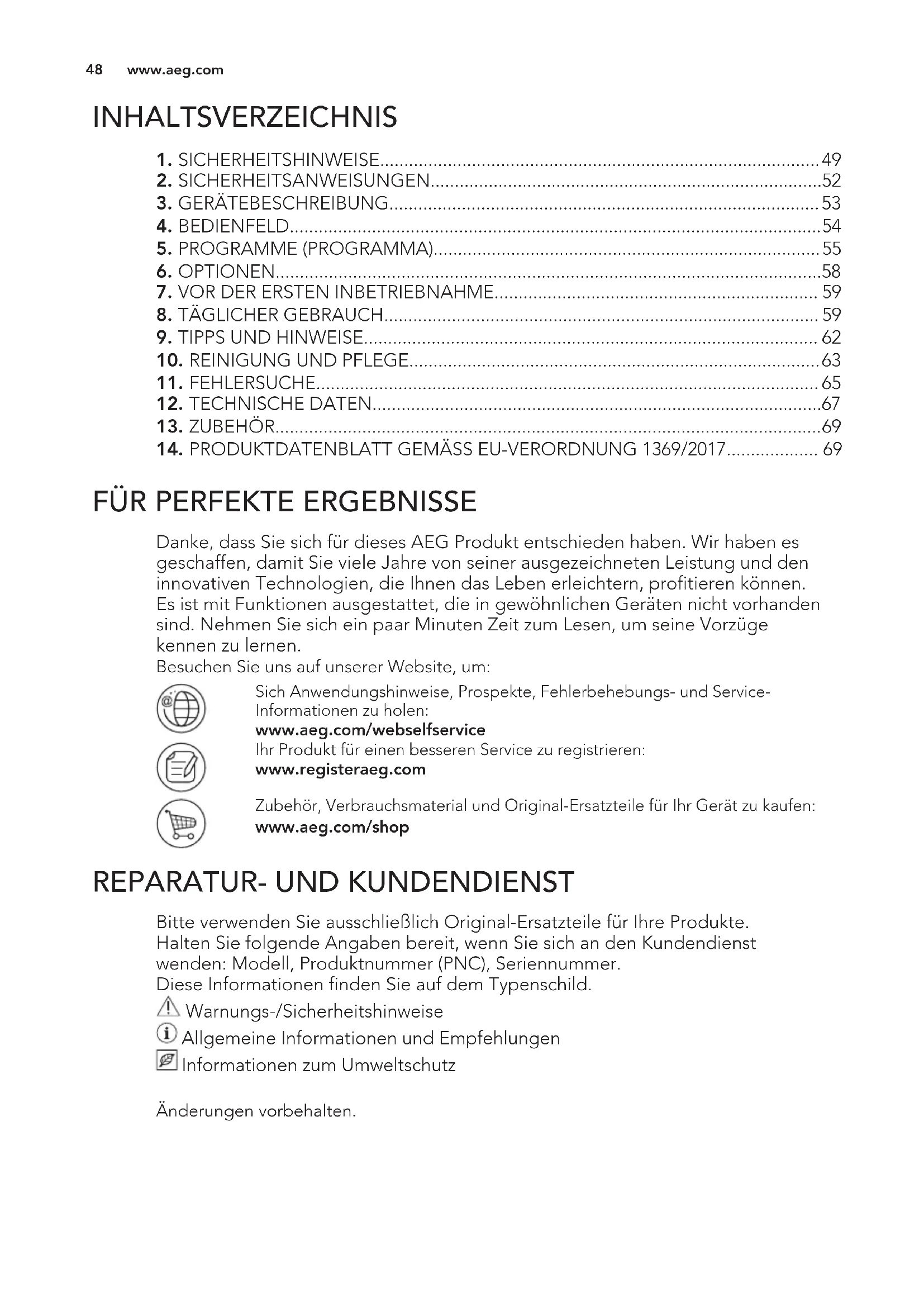 Danke, dass Sie sich für dieses AEG Produkt entschieden haben. Wir haben es geschaffen, damit Sie viele Jahre von seiner ausgezeichneten Leistung und den innovativen Technologien, die Ihnen das Leben erleichtern, profitieren können. Es ist mit Funktionen ausgestattet, die in gewöhnlichen Geräten nicht vorhanden sind. Nehmen Sie sich ein paar Minuten Zeit zum Lesen, um seine Vorzüge kennen zu lernen. Besuchen Sie uns auf unserer Website, um: Sich Anwendungshinweise, Prospekte, Fehlerbehebungs- und Service- Informationen zu holen: www.aeg.com/webselfservice Ihr Produkt für einen besseren Service zu registrieren: www.registeraeg.com Zubehör, Verbrauchsmaterial und Original-Ersatzteile für Ihr Gerät zu kaufen: www.aeg.com/shop