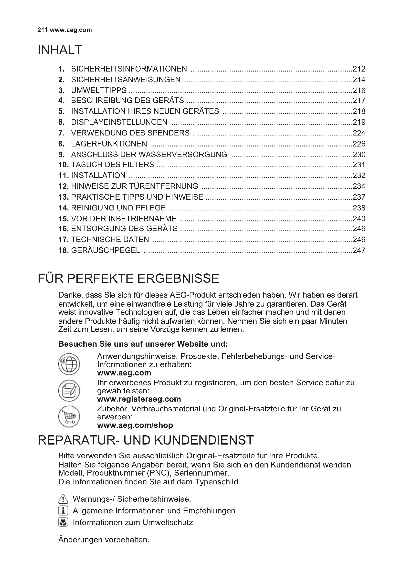 Danke, dass Sie sich für dieses AEG-Produkt entschieden haben. Wir haben es derart entwickelt, um eine einwandfreie Leistung für viele Jahre zu garantieren. Das Gerät weist innovative Technologien auf, die das Leben einfacher machen und mit denen andere Produkte häug nicht aufwarten können. Nehmen Sie sich ein paar Minuten Zeit zum Lesen, um seine Vorzüge kennen zu lernen. Bitte verwenden Sie ausschließlich Original-Ersatzteile für Ihre Produkte. Halten Sie folgende Angaben bereit, wenn Sie sich an den Kundendienst wenden Modell, Produktnummer (PNC), Seriennummer. Die Informationen nden Sie auf dem Typenschild. BesuchenSieunsaufunsererWebsiteund: Anwendungshinweise, Prospekte, Fehlerbehebungs- und Service- Informationen zu erhalten: www.aeg.com Ihr erworbenes Produkt zu registrieren, um den besten Service dafür zu gewährleisten: www.registeraeg.com Zubehör, Verbrauchsmaterial und Original-Ersatzteile für Ihr Gerät zu erwerben: www.aeg.com/shop Warnungs-/ Sicherheitshinweise. Allgemeine Informationen und Empfehlungen. Informationen zum Umweltschutz.