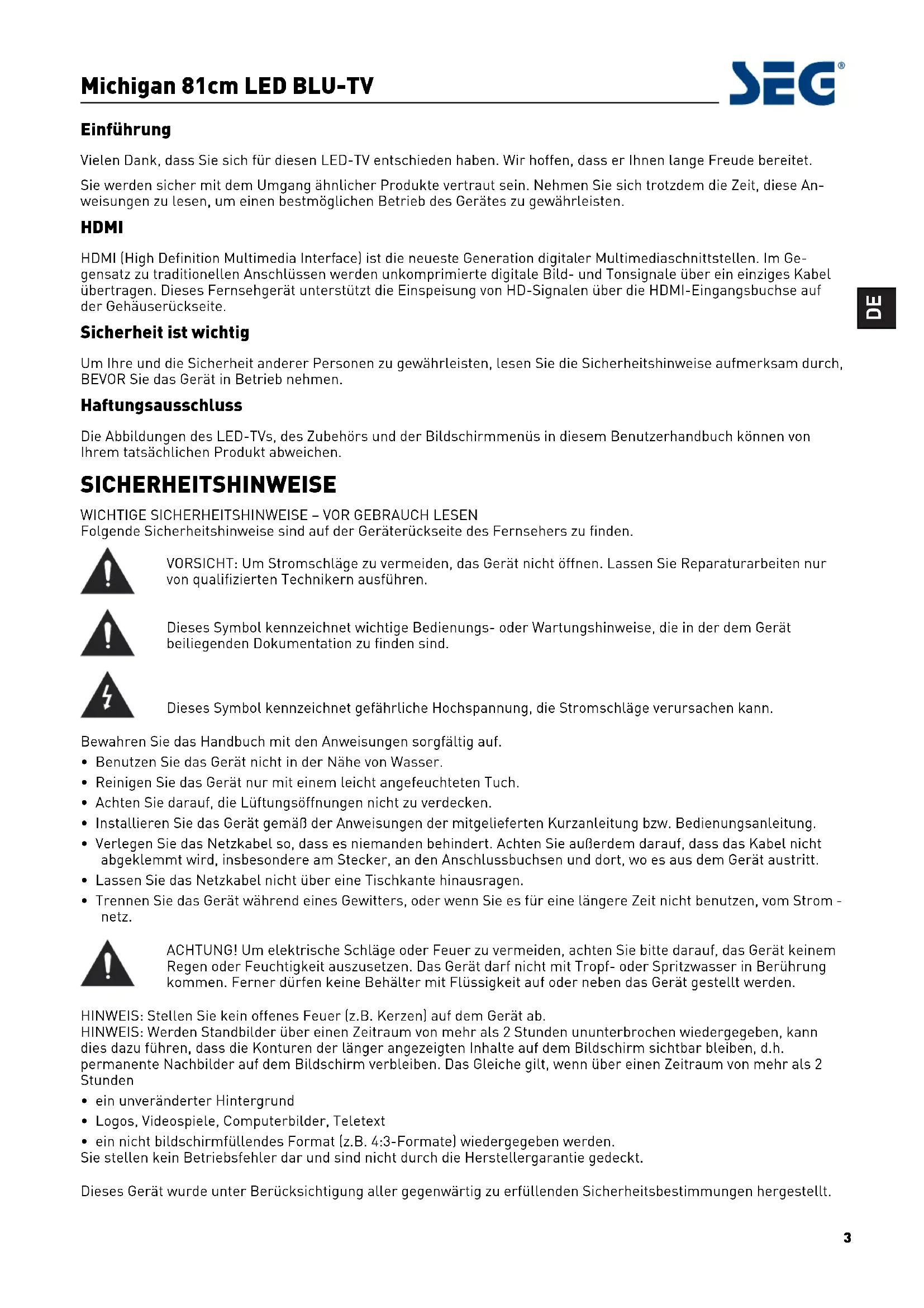 - ein nicht bildschirmfüllendes Format (z.B. 4:3-Formate) wiedergegeben werden. Sie stellen kein Betriebsfehler dar und sind nicht durch die Herstellergarantie gedeckt. Dieses Gerät wurde unter Berücksichtigung aller gegenwärtig zu erfüllenden Sicherheitsbestimmungen hergestellt.4 Michigan 81cm LED BLU-TV Folgende Sicherheitshinweise dienen zum Schutz gegen fahrlässigen Gebrauch und Folgeschäden.