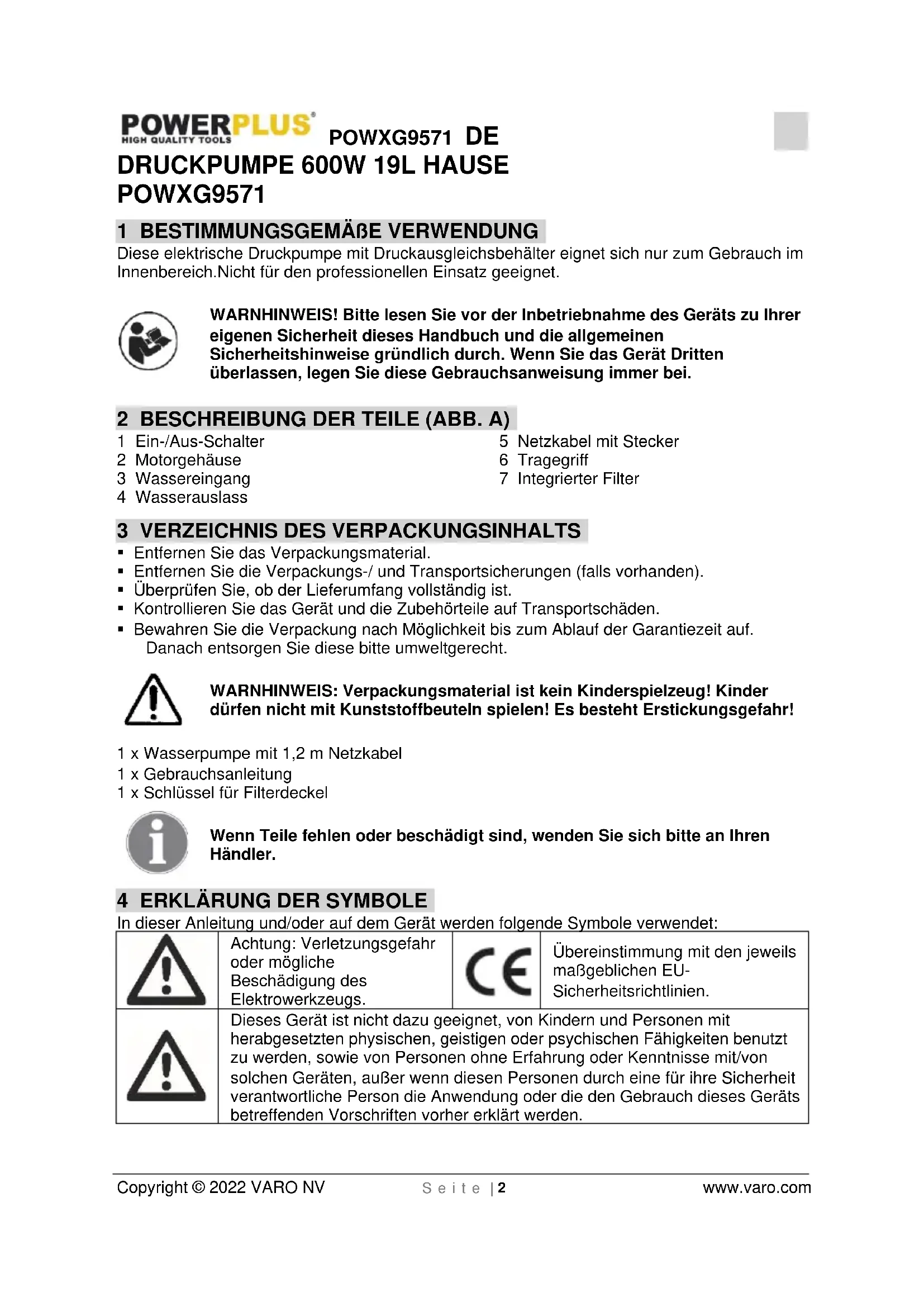 - Die Pumpe ist für den Gebrauch in Swimming Pools, Teichen, Bädern und bei anderen Umständen nicht geeignet, in denen Personen mit dem Wasser in Berührung kommen können, und sie darf daher für solche Zwecke nicht verwendet werden.POWXG9571 DE Copyright © 2022 VARO NV S e i t e | 5 www.varo.com