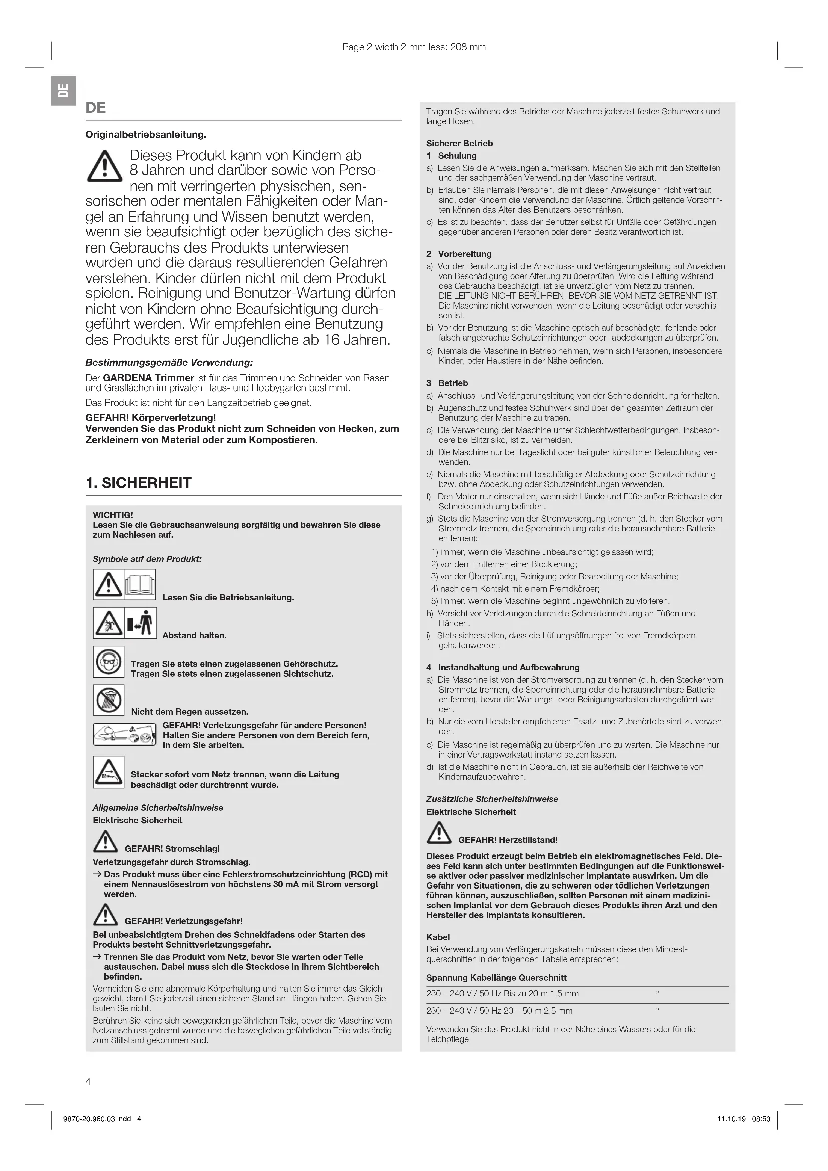 9870-20.960.03.indd 3 11.10.19 08:53DE Originalbetriebsanleitung. Dieses Produkt kann von Kindern ab 8Jahren und darüber sowie von Perso- nenmit verringerten physischen, sen- sorischen oder mentalen Fähigkeiten oder Man- gelan Erfahrung und Wissen benutzt werden, wenn sie beaufsichtigt oder bezüglich des siche- ren Gebrauchs des Produkts unterwiesen wurden und die daraus resultierenden Gefahren verstehen. Kinder dürfen nicht mit dem Produkt spielen. Reinigung und Benutzer-Wartung dürfen nicht von Kindern ohne Beaufsichtigung durch- geführt werden. Wir empfehlen eine Benutzung des Produkts erst für Jugendliche ab 16 Jahren. Bestimmungsgemäße Verwendung: Der GARDENA Trimmer ist für das Trimmen und Schneiden von Rasen und Grasflächen im privaten Haus- und Hobbygarten bestimmt. Das Produkt ist nicht für den Langzeitbetrieb geeignet. GEFAHR! Körperverletzung! Verwenden Sie das Produkt nicht zum Schneiden von Hecken, zum Zerkleinern von Material oder zum Kompostieren. Tragen Sie während des Betriebs der Maschine jederzeit festes Schuhwerk und lange Hosen. Sicherer Betrieb 1 Schulung a) Lesen Sie die Anweisungen aufmerksam. Machen Sie sich mit den Stellteilen und der sachgemäßen Verwendung der Maschine vertraut. b) Erlauben Sie niemals Personen, die mit diesen Anweisungen nicht vertraut sind, oder Kindern die Verwendung der Maschine. Örtlich geltende Vorschrif- ten können das Alter des Benutzers beschränken. c) Es ist zu beachten, dass der Benutzer selbst für Unfälle oder Gefährdungen gegenüber anderen Personen oder deren Besitz verantwortlich ist. 2 Vorbereitung a) Vor der Benutzung ist die Anschluss- und Verlängerungsleitung auf Anzeichen von Beschädigung oder Alterung zu überprüfen. Wird die Leitung während des Gebrauchs beschädigt, ist sie unverzüglich vom Netz zu trennen. DIE LEITUNG NICHT BERÜHREN, BEVOR SIE VOM NETZ GETRENNT IST. Die Maschine nicht verwenden, wenn die Leitung beschädigt oder verschlis- sen ist. b) Vor der Benutzung ist die Maschine optisch auf beschädigte, fehlende oder falsch angebrachte Schutzeinrichtungen oder -abdeckungen zu überprüfen. c) Niemals die Maschine in Betrieb nehmen, wenn sich Personen, insbesondere Kinder, oder Haustiere in der Nähe befinden. 3 Betrieb a) Anschluss- und Verlängerungsleitung von der Schneideinrichtung fernhalten. b) Augenschutz und festes Schuhwerk sind über den gesamten Zeitraum der Benutzung der Maschine zu tragen. c) Die Verwendung der Maschine unter Schlechtwetterbedingungen, insbeson- dere bei Blitzrisiko, ist zu vermeiden. d) Die Maschine nur bei Tageslicht oder bei guter künstlicher Beleuchtung ver- wenden. e) Niemals die Maschine mit beschädigter Abdeckung oder Schutzeinrichtung bzw. ohne Abdeckung oder Schutzeinrichtungen verwenden. f) Den Motor nur einschalten, wenn sich Hände und Füße außer Reichweite der Schneideinrichtung befinden. g) Stets die Maschine von der Stromversorgung trennen (d. h. den Stecker vom Stromnetz trennen, die Sperreinrichtung oder die herausnehmbare Batterie entfernen):