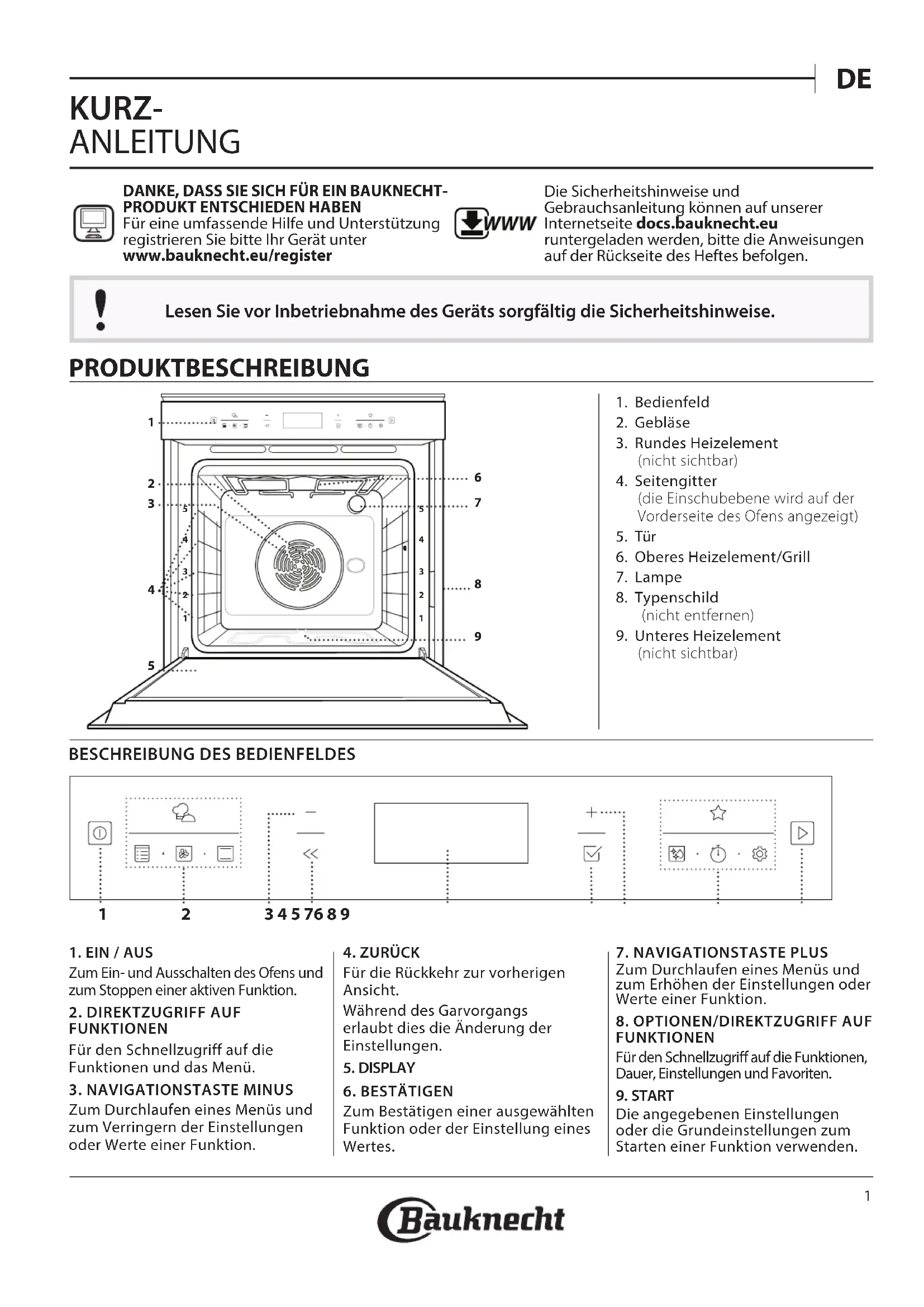 KURZ- ANLEITUNG DANKE, DASS SIE SICH FÜR EIN BAUKNECHT-PRODUKT ENTSCHIEDEN HABENFür eine umfassende Hilfe und Unterstützung registrieren Sie bitte Ihr Gerät unter www. bauknecht. eu/ register WWW Die Sicherheitshinweise und Gebrauchsanleitung können auf unserer Internetseite docs . bauknecht . eu runtergeladen werden, bitte die Anweisungen auf der Rückseite des Heftes befolgen. Lesen Sie vor Inbetriebnahme des Geräts sorgfältig die Sicherheitshinweise. PRODUKTBESCHREIBUNG 1. Bedienfeld2. Gebläse3. Rundes Heizelement (nicht sichtbar)4. Seitengitter (die Einschubebene wird auf der Vorderseite des Ofens angezeigt)5. Tür6. Oberes Heizelement/Grill7. Lampe8. Typenschild (nicht entfernen)9. Unteres Heizelement (nicht sichtbar)BESCHREIBUNG DES BEDIENFELDES