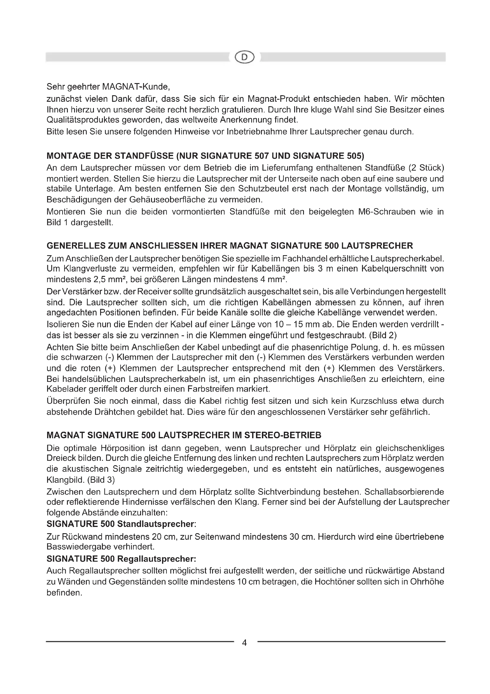 Abbildungen/IllustrationsSehr geehrter MAGNAT-Kunde, zunächst vielen Dank dafür, dass Sie sich für ein Magnat-Produkt entschieden haben. Wir möchten Ihnen hierzu von unserer Seite recht herzlich gratulieren. Durch Ihre kluge Wahl sind Sie Besitzer eines Qualitätsproduktes geworden, das weltweite Anerkennung ndet. Bitte lesen Sie unsere folgenden Hinweise vor Inbetriebnahme Ihrer Lautsprecher genau durch. MONTAGE DER STANDFÜSSE (NUR SIGNATURE 507 UND SIGNATURE 505) An dem Lautsprecher müssen vor dem Betrieb die im Lieferumfang enthaltenen Standfüße (2 Stück) montiert werden. Stellen Sie hierzu die Lautsprecher mit der Unterseite nach oben auf eine saubere und stabile Unterlage. Am besten entfernen Sie den Schutzbeutel erst nach der Montage vollständig, um Beschädigungen der Gehäuseoberäche zu vermeiden. Montieren Sie nun die beiden vormontierten Standfüße mit den beigelegten M6-Schrauben wie in Bild 1 dargestellt. GENERELLES ZUM ANSCHLIESSEN IHRER MAGNAT SIGNATURE 500 LAUTSPRECHER Zum Anschließen der Lautsprecher benötigen Sie spezielle im Fachhandel erhältliche Lautsprecherkabel. Um Klangverluste zu vermeiden, empfehlen wir für Kabellängen bis 3 m einen Kabelquerschnitt von mindestens 2,5 mm², bei größeren Längen mindestens 4 mm². Der Verstärker bzw. der Receiver sollte grundsätzlich ausgeschaltet sein, bis alle Verbindungen hergestellt sind. Die Lautsprecher sollten sich, um die richtigen Kabellängen abmessen zu können, auf ihren angedachten Positionen benden. Für beide Kanäle sollte die gleiche Kabellänge verwendet werden. Isolieren Sie nun die Enden der Kabel auf einer Länge von 10 – 15 mm ab. Die Enden werden verdrillt - das ist besser als sie zu verzinnen - in die Klemmen eingeführt und festgeschraubt. (Bild 2) Achten Sie bitte beim Anschließen der Kabel unbedingt auf die phasenrichtige Polung, d. h. es müssen die schwarzen (-) Klemmen der Lautsprecher mit den (-) Klemmen des Verstärkers verbunden werden und die roten (+) Klemmen der Lautsprecher entsprechend mit den (+) Klemmen des Verstärkers. Bei handelsüblichen Lautsprecherkabeln ist, um ein phasenrichtiges Anschließen zu erleichtern, eine Kabelader geriffelt oder durch einen Farbstreifen markiert. Überprüfen Sie noch einmal, dass die Kabel richtig fest sitzen und sich kein Kurzschluss etwa durch abstehende Drähtchen gebildet hat. Dies wäre für den angeschlossenen Verstärker sehr gefährlich.