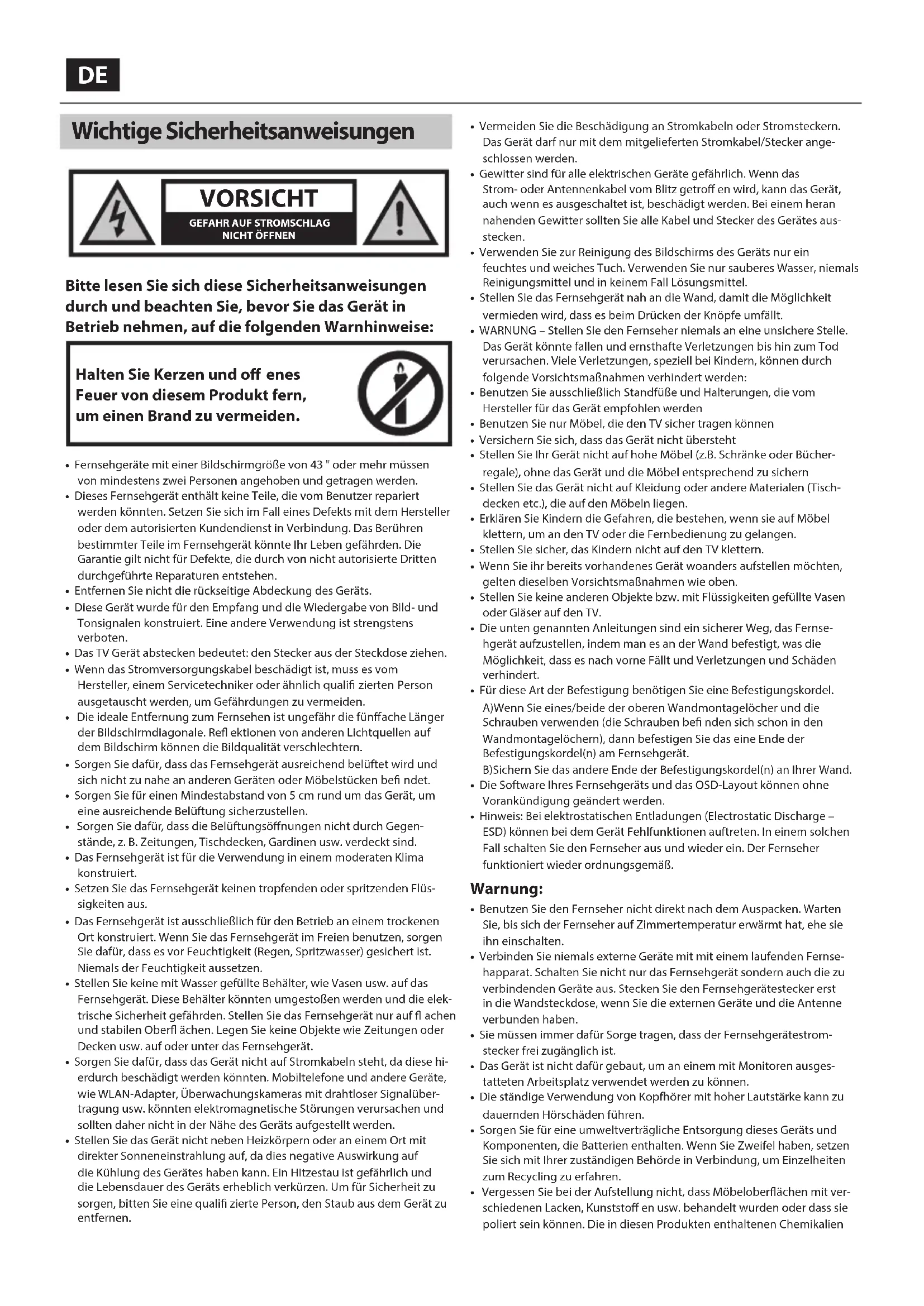 - Hinweis: Bei elektrostatischen Entladungen (Electrostatic Discharge – ESD) können bei dem Gerät Fehlfunktionen auftreten. In einem solchen Fall schalten Sie den Fernseher aus und wieder ein. Der Fernseher funktioniert wieder ordnungsgemäß. Warnung: