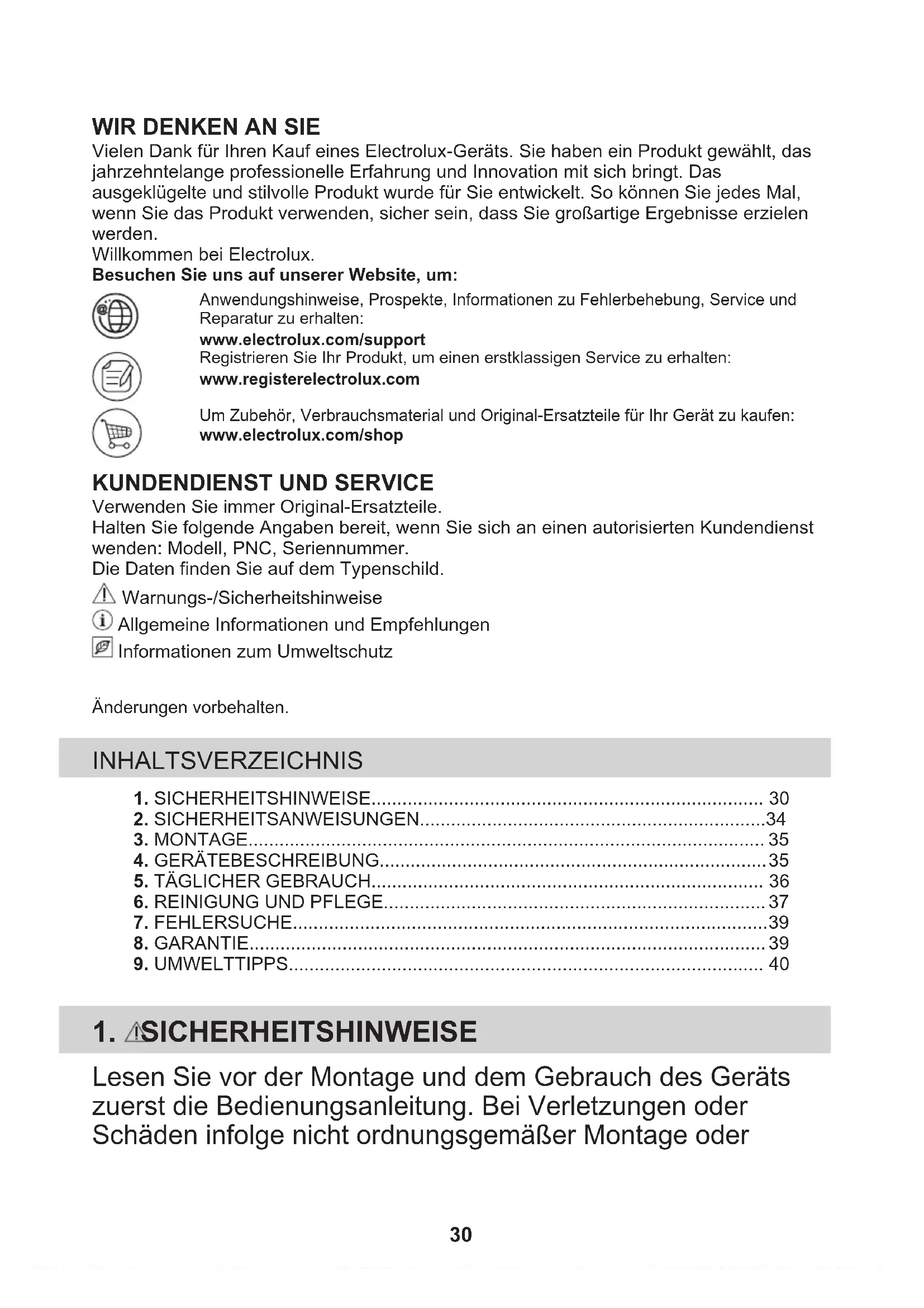Vielen Dank für Ihren Kauf eines Electrolux-Geräts. Sie haben ein Produkt gewählt, dasjahrzehntelange professionelle Erfahrung und Innovation mit sich bringt. Dasausgeklügelte und stilvolle Produkt wurde für Sie entwickelt. So können Sie jedes Mal,wenn Sie das Produkt verwenden, sicher sein, dass Sie großartige Ergebnisse erzielenwerden.Willkommen bei Electrolux.Besuchen Sie uns auf unserer Website, um:Anwendungshinweise, Prospekte, Informationen zu Fehlerbehebung, Service undReparatur zu erhalten:www.electrolux.com/supportRegistrieren Sie Ihr Produkt, um einen erstklassigen Service zu erhalten:www.registerelectrolux.comUm Zubehör, Verbrauchsmaterial und Original-Ersatzteile für Ihr Gerät zu kaufen:www.electrolux.com/shop