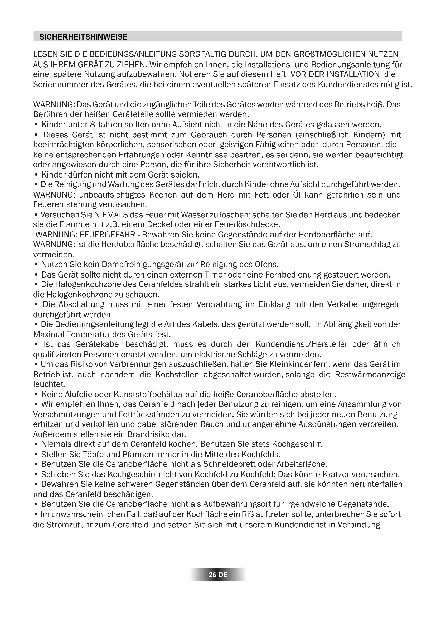 - Um das Risiko von Verbrennungen auszuschließen, halten Sie Kleinkinder fern, wenn das Gerät im Betrieb ist, auch nachdem die Kochstellen abgeschaltet wurden, solange die Restwärmeanzeige leuchtet.
