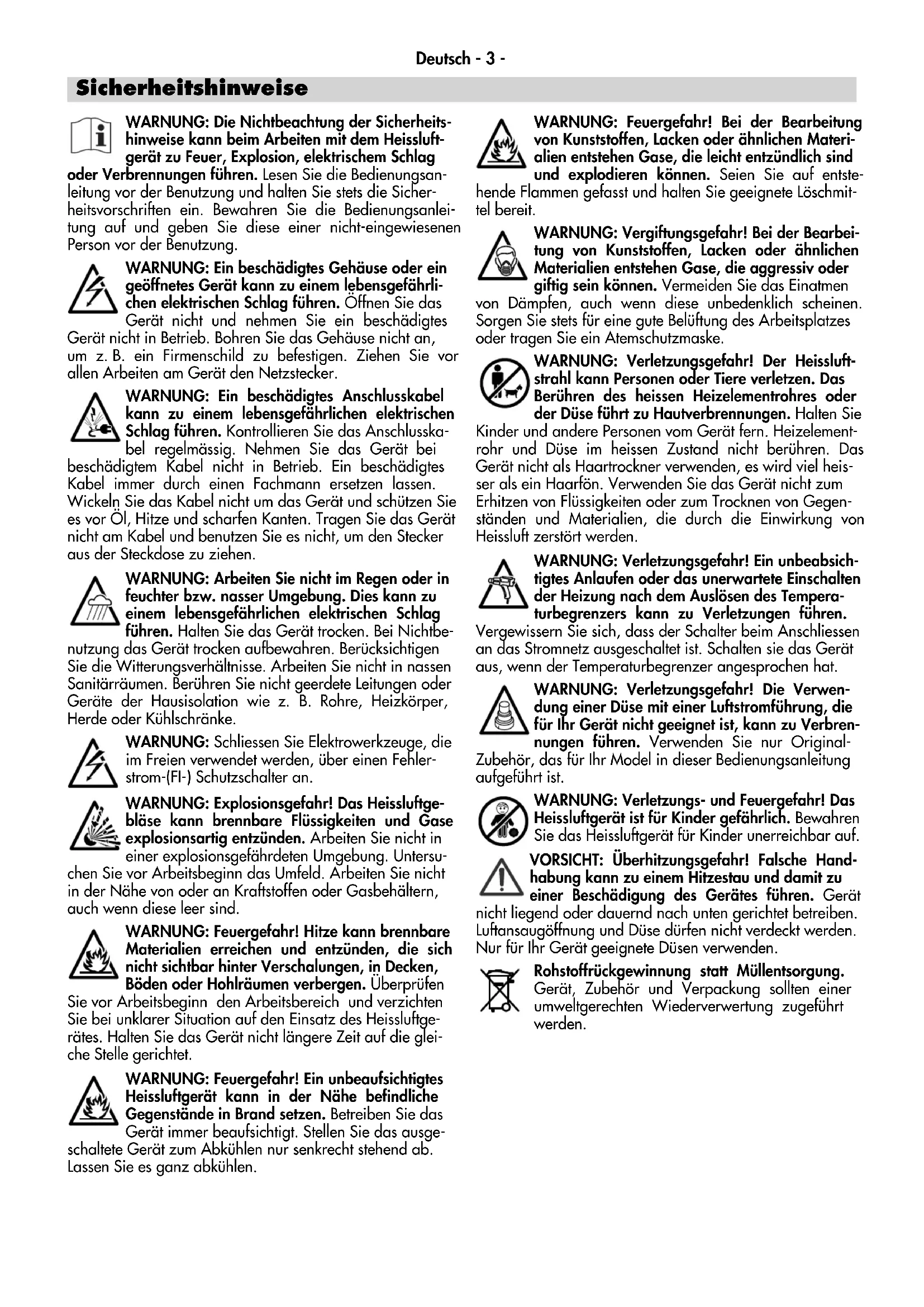 ...................................................97Deutsch - 3 - WARNUNG: Die Nichtbeachtung der Sicherheits- hinweise kann beim Arbeiten mit dem Heissluft- gerät zu Feuer, Explosion, elektrischem Schlag oder Verbrennungen führen. Lesen Sie die Bedienungsan- leitung vor der Benutzung und halten Sie stets die Sicher- heitsvorschriften ein. Bewahren Sie die Bedienungsanlei- tung auf und geben Sie diese einer nicht-eingewiesenen Person vor der Benutzung. WARNUNG: Ein beschädigtes Gehäuse oder ein geöffnetes Gerät kann zu einem lebensgefährli- chen elektrischen Schlag führen. Öffnen Sie das Gerät nicht und nehmen Sie ein beschädigtes Gerät nicht in Betrieb. Bohren Sie das Gehäuse nicht an, um z. B. ein Firmenschild zu befestigen. Ziehen Sie vor allen Arbeiten am Gerät den Netzstecker. WARNUNG: Ein beschädigtes Anschlusskabel kann zu einem lebensgefährlichen elektrischen Schlag führen. Kontrollieren Sie das Anschlusska- bel regelmässig. Nehmen Sie das Gerät bei beschädigtem Kabel nicht in Betrieb. Ein beschädigtes Kabel immer durch einen Fachmann ersetzen lassen. Wickeln Sie das Kabel nicht um das Gerät und schützen Sie es vor Öl, Hitze und scharfen Kanten. Tragen Sie das Gerät nicht am Kabel und benutzen Sie es nicht, um den Stecker aus der Steckdose zu ziehen. WARNUNG: Arbeiten Sie nicht im Regen oder in feuchter bzw. nasser Umgebung. Dies kann zu einem lebensgefährlichen elektrischen Schlag führen. Halten Sie das Gerät trocken. Bei Nichtbe- nutzung das Gerät trocken aufbewahren. Berücksichtigen Sie die Witterungsverhältnisse. Arbeiten Sie nicht in nassen Sanitärräumen. Berühren Sie nicht geerdete Leitungen oder Geräte der Hausisolation wie z. B. Rohre, Heizkörper, Herde oder Kühlschränke. WARNUNG: Schliessen Sie Elektrowerkzeuge, die im Freien verwendet werden, über einen Fehler- strom-(FI-) Schutzschalter an. WARNUNG: Explosionsgefahr! Das Heissluftge- bläse kann brennbare Flüssigkeiten und Gase explosionsartig entzünden. Arbeiten Sie nicht in einer explosionsgefährdeten Umgebung. Untersu- chen Sie vor Arbeitsbeginn das Umfeld. Arbeiten Sie nicht in der Nähe von oder an Kraftstoffen oder Gasbehältern, auch wenn diese leer sind. WARNUNG: Feuergefahr! Hitze kann brennbare Materialien erreichen und entzünden, die sich nicht sichtbar hinter Verschalungen, in Decken, Böden oder Hohlräumen verbergen. Überprüfen Sie vor Arbeitsbeginn den Arbeitsbereich und verzichten Sie bei unklarer Situation auf den Einsatz des Heissluftge- rätes. Halten Sie das Gerät nicht längere Zeit auf die glei- che Stelle gerichtet. WARNUNG: Feuergefahr! Ein unbeaufsichtigtes Heissluftgerät kann in der Nähe befindliche Gegenstände in Brand setzen. Betreiben Sie das Gerät immer beaufsichtigt. Stellen Sie das ausge- schaltete Gerät zum Abkühlen nur senkrecht stehend ab. Lassen Sie es ganz abkühlen. WARNUNG: Feuergefahr! Bei der Bearbeitung von Kunststoffen, Lacken oder ähnlichen Materi- alien entstehen Gase, die leicht entzündlich sind und explodieren können. Seien Sie auf entste- hende Flammen gefasst und halten Sie geeignete Löschmit- tel bereit. WARNUNG: Vergiftungsgefahr! Bei der Bearbei- tung von Kunststoffen, Lacken oder ähnlichen Materialien entstehen Gase, die aggressiv oder giftig sein können. Vermeiden Sie das Einatmen von Dämpfen, auch wenn diese unbedenklich scheinen. Sorgen Sie stets für eine gute Belüftung des Arbeitsplatzes oder tragen Sie ein Atemschutzmaske. WARNUNG: Verletzungsgefahr! Der Heissluft- strahl kann Personen oder Tiere verletzen. Das Berühren des heissen Heizelementrohres oder der Düse führt zu Hautverbrennungen. Halten Sie Kinder und andere Personen vom Gerät fern. Heizelement- rohr und Düse im heissen Zustand nicht berühren. Das Gerät nicht als Haartrockner verwenden, es wird viel heis- ser als ein Haarfön. Verwenden Sie das Gerät nicht zum Erhitzen von Flüssigkeiten oder zum Trocknen von Gegen- ständen und Materialien, die durch die Einwirkung von Heissluft zerstört werden. WARNUNG: Verletzungsgefahr! Ein unbeabsich- tigtes Anlaufen oder das unerwartete Einschalten der Heizung nach dem Auslösen des Tempera- turbegrenzers kann zu Verletzungen führen. Vergewissern Sie sich, dass der Schalter beim Anschliessen an das Stromnetz ausgeschaltet ist. Schalten sie das Gerät aus, wenn der Temperaturbegrenzer angesprochen hat. WARNUNG: Verletzungsgefahr! Die Verwen- dung einer Düse mit einer Luftstromführung, die für Ihr Gerät nicht geeignet ist, kann zu Verbren- nungen führen. Verwenden Sie nur Original- Zubehör, das für Ihr Model in dieser Bedienungsanleitung aufgeführt ist. WARNUNG: Verletzungs- und Feuergefahr! Das Heissluftgerät ist für Kinder gefährlich. Bewahren Sie das Heissluftgerät für Kinder unerreichbar auf. VORSICHT: Überhitzungsgefahr! Falsche Hand- habung kann zu einem Hitzestau und damit zu einer Beschädigung des Gerätes führen. Gerät nicht liegend oder dauernd nach unten gerichtet betreiben. Luftansaugöffnung und Düse dürfen nicht verdeckt werden. Nur für Ihr Gerät geeignete Düsen verwenden. Rohstoffrückgewinnung statt Müllentsorgung. Gerät, Zubehör und Verpackung sollten einer umweltgerechten Wiederverwertung zugeführt werden. SicherheitshinweiseDeutsch - 4 - Dieses Heissluftgerät ist unter Einhaltung der Sicherheitsvorschriften und Verwendung von Original-Zubehör für alle in dieser Bedienungsanleitung aufgeführten Anwendungen mit Heissluft bestimmt. Eine herunterfallende Düse kann einen Gegenstand entzünden. Die Düsen müssen fest und sicher auf dem Gerät montiert sein. Das Berühren der heissen Düse kann zu einer schweren Verbrennung führen. Vor dem Aufsetzen bzw. Wechseln der Düse das Gerät ganz abkühlen lassen oder ein geeignetes Werkzeug benutzen. Eine heisse Düse kann eine Unterlage entzünden. Legen Sie die heisse Düse nur auf einer feuerfesten Unterlage ab. Eine falsche oder defekte Düse kann zu Heissluftrückschlag führen und das Gerät beschäd