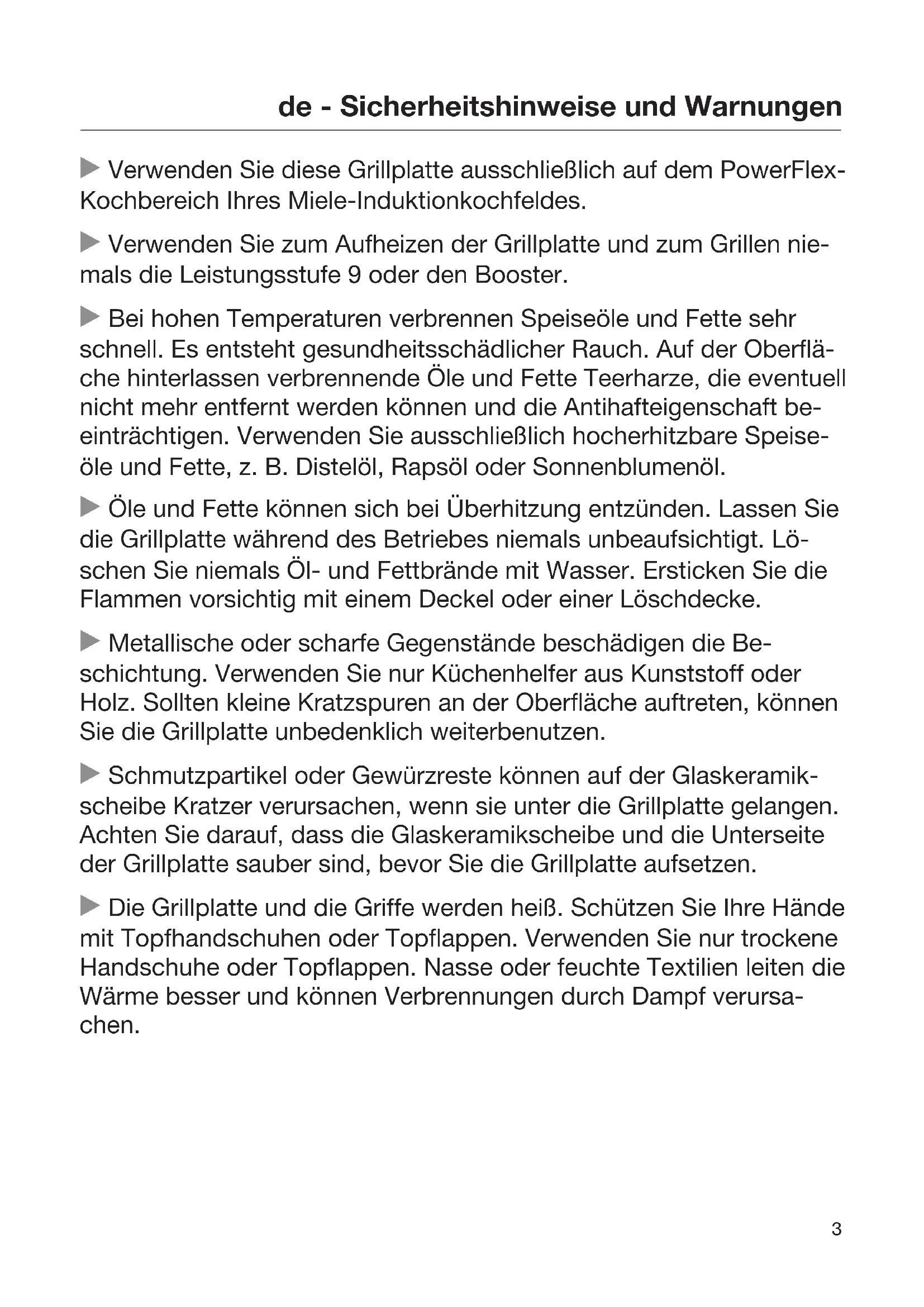 Verwenden Sie diese Grillplatte ausschließlich auf dem PowerFlex- Kochbereich Ihres Miele-Induktionkochfeldes. Verwenden Sie zum Aufheizen der Grillplatte und zum Grillen nie- mals die Leistungsstufe 9 oder den Booster. Bei hohen Temperaturen verbrennen Speiseöle und Fette sehr schnell. Es entsteht gesundheitsschädlicher Rauch. Auf der Oberflä- che hinterlassen verbrennende Öle und Fette Teerharze, die eventuell nicht mehr entfernt werden können und die Antihafteigenschaft be- einträchtigen. Verwenden Sie ausschließlich hocherhitzbare Speise- öle und Fette, z.B. Distelöl, Rapsöl oder Sonnenblumenöl. Öle und Fette können sich bei Überhitzung entzünden. Lassen Sie die Grillplatte während des Betriebes niemals unbeaufsichtigt. Lö- schen Sie niemals Öl- und Fettbrände mit Wasser. Ersticken Sie die Flammen vorsichtig mit einem Deckel oder einer Löschdecke. Metallische oder scharfe Gegenstände beschädigen die Be- schichtung. Verwenden Sie nur Küchenhelfer aus Kunststoff oder Holz. Sollten kleine Kratzspuren an der Oberfläche auftreten, können Sie die Grillplatte unbedenklich weiterbenutzen. Schmutzpartikel oder Gewürzreste können auf der Glaskeramik- scheibe Kratzer verursachen, wenn sie unter die Grillplatte gelangen. Achten Sie darauf, dass die Glaskeramikscheibe und die Unterseite der Grillplatte sauber sind, bevor Sie die Grillplatte aufsetzen. Die Grillplatte und die Griffe werden heiß. Schützen Sie Ihre Hände mit Topfhandschuhen oder Topflappen. Verwenden Sie nur trockene Handschuhe oder Topflappen. Nasse oder feuchte Textilien leiten die Wärme besser und können Verbrennungen durch Dampf verursa- chen.de - Ihr Beitrag zum Umweltschutz