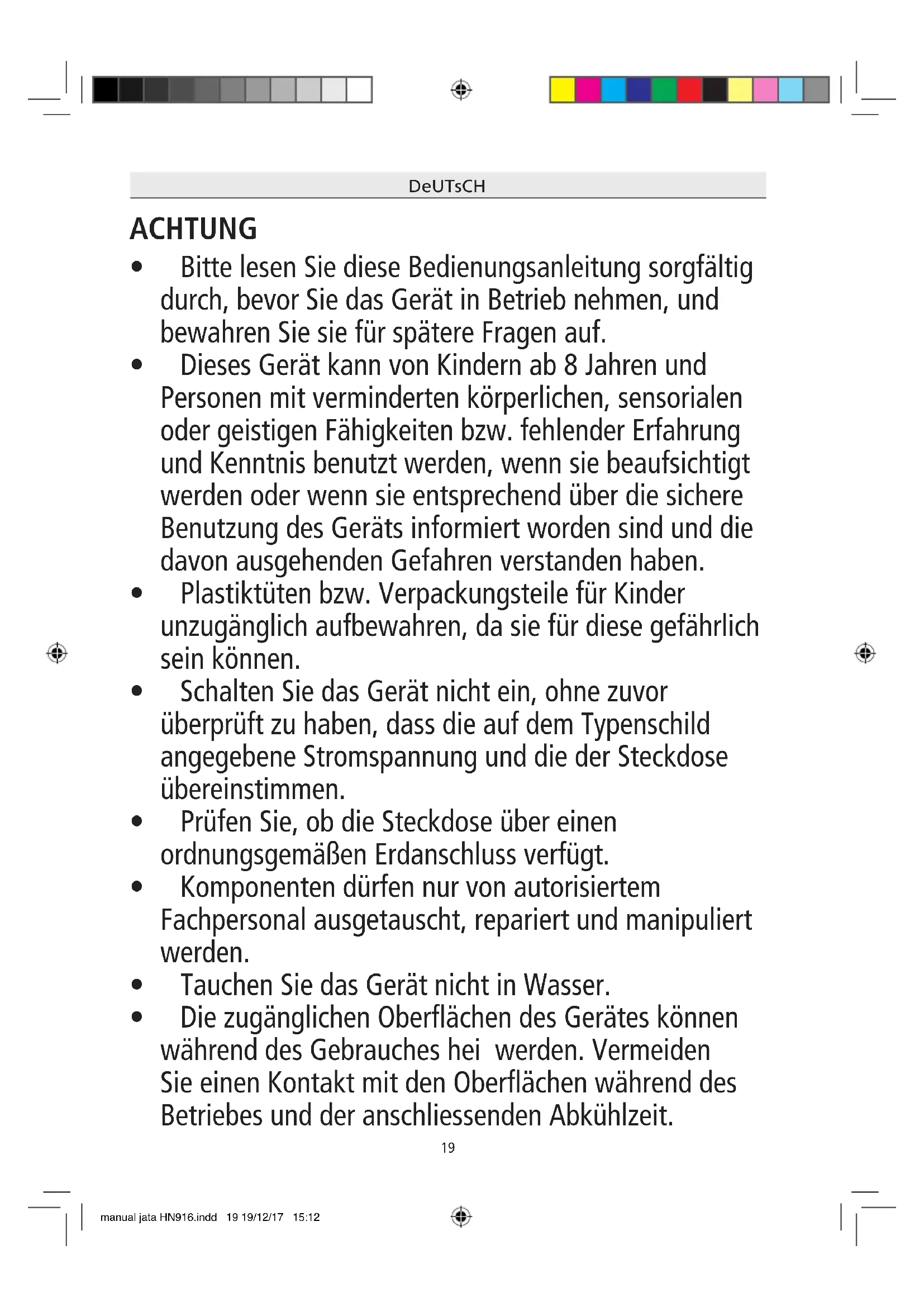 - Die zugänglichen Oberächen des Gerätes können während des Gebrauches heiβ werden. Vermeiden Sie einen Kontakt mit den Oberächen während des Betriebes und der anschliessenden Abkühlzeit. manual jata HN916.indd 19 19/12/17 15:1220