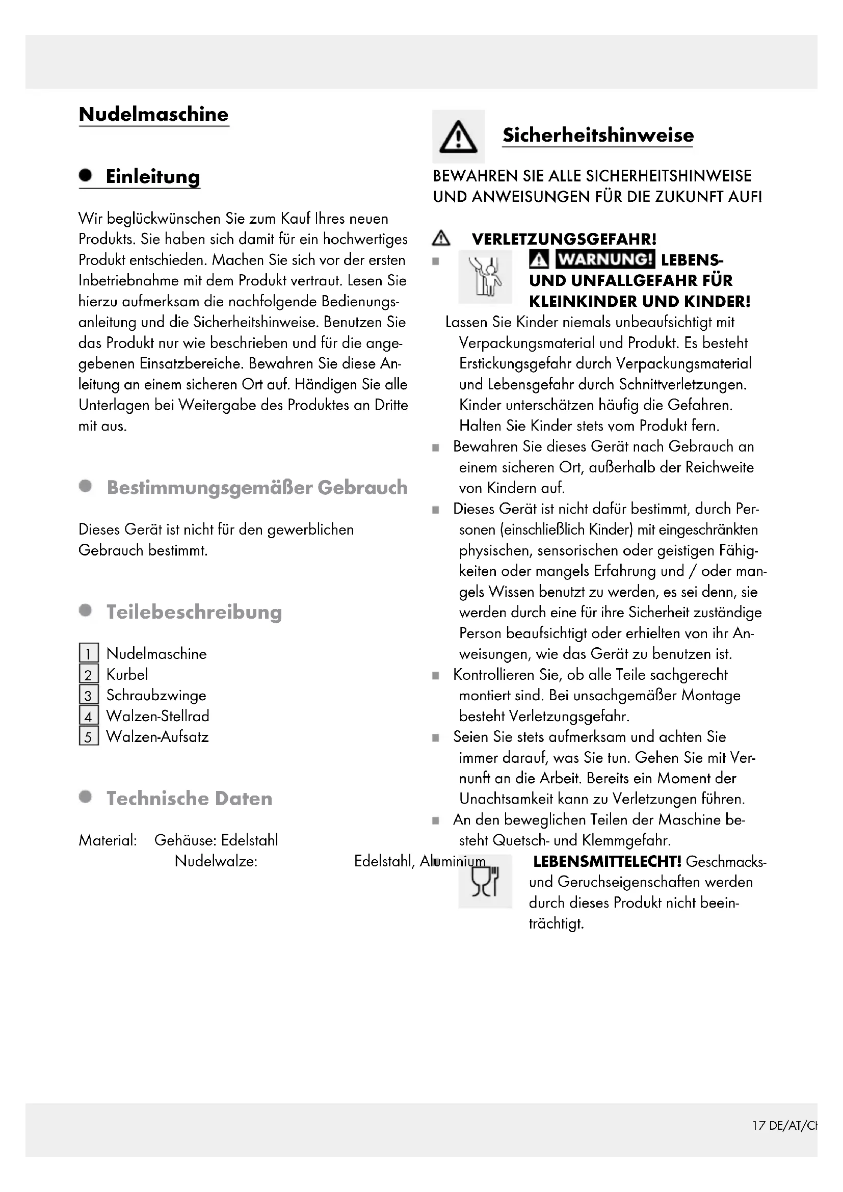 Reiniging en onderhoud (zie afb. L–O) Gebruik nooit benzine, oplosmiddel of chemi- sche reinigers. Reinig tijdens het gebruik de schaaf onder de walsen met een droge doek. Gebruik een zachte, schone doek voor de reiniging van de pastamachine. Gebruik een borstel of een houten staaf om de pastamachine na gebruik te reinigen. Verwijder sterke verontreinigingen met een vochtige doek en droog de onderdelen vervol- gens volledig af. De pastamachine mag in géén geval in water afgewassen of in de vaatwasmachine gereinigd worden. Dompel het product nooit onder in water of andere vloeistoffen. Hierdoor kan het product beschadigd raken. Afvoer De verpakking bestaat uit milieuvriendelijke grond- stoffen die u via de plaatselijke recyclingcontainers kunt afvoeren. Informatie over de mogelijkheden om het uitgedien- de product na gebruik te verwijderen, verstrekt uw gemeentelijke overheid.17 DE/AT/CH Nudelmaschine Einleitung Wir beglückwünschen Sie zum Kauf Ihres neuen Produkts. Sie haben sich damit für ein hochwertiges Produkt entschieden. Machen Sie sich vor der ersten Inbetriebnahme mit dem Produkt vertraut. Lesen Sie hierzu aufmerksam die nachfolgende Bedienungs- anleitung und die Sicherheitshinweise. Benutzen Sie das Produkt nur wie beschrieben und für die ange- gebenen Einsatzbereiche. Bewahren Sie diese An- leitung an einem sicheren Ort auf. Händigen Sie alle Unterlagen bei Weitergabe des Produktes an Dritte mit aus. Bestimmungsgemäßer Gebrauch Dieses Gerät ist nicht für den gewerblichen Gebrauch bestimmt. Teilebeschreibung
