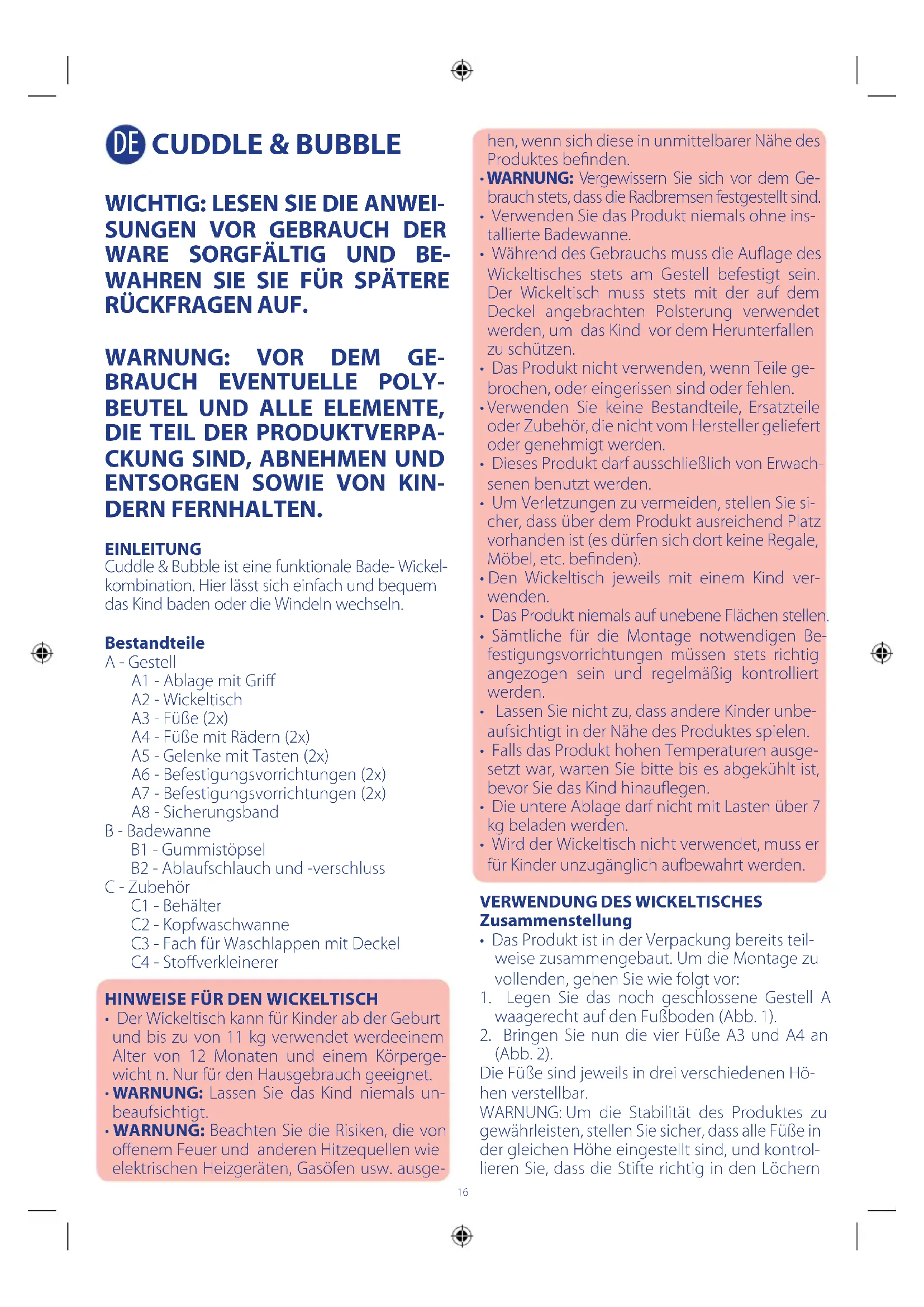 DERN FERNHALTEN. EINLEITUNG Cuddle & Bubble ist eine funktionale Bade- Wickel- kombination. Hier lässt sich einfach und bequem das Kind baden oder die Windeln wechseln. Bestandteile A - Gestell A1 - Ablage mit Gri A2 - Wickeltisch A3 - Füße (2x) A4 - Füße mit Rädern (2x) A5 - Gelenke mit Tasten (2x) A6 - Befestigungsvorrichtungen (2x) A7 - Befestigungsvorrichtungen (2x) A8 - Sicherungsband B - Badewanne B1 - Gummistöpsel B2 - Ablaufschlauch und -verschluss C - Zubehör C1 - Behälter C2 - Kopfwaschwanne C3 - Fach für Waschlappen mit Deckel C4 - Stoverkleinerer