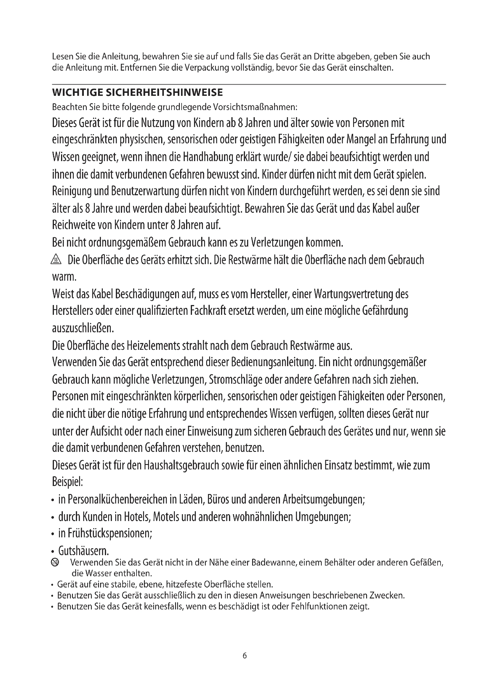 AE6 Lesen Sie die Anleitung, bewahren Sie sie auf und falls Sie das Gerät an Dritte abgeben, geben Sie auch die Anleitung mit. Entfernen Sie die Verpackung vollständig, bevor Sie das Gerät einschalten. WICHTIGE SICHERHEITSHINWEISE Beachten Sie bitte folgende grundlegende Vorsichtsmaßnahmen: Dieses Gerät ist für die Nutzung von Kindern ab 8 Jahren und älter sowie von Personen mit eingeschränkten physischen, sensorischen oder geistigen Fähigkeiten oder Mangel an Erfahrung und Wissen geeignet, wenn ihnen die Handhabung erklärt wurde/ sie dabei beaufsichtigt werden und ihnen die damit verbundenen Gefahren bewusst sind. Kinder dürfen nicht mit dem Gerät spielen. Reinigung und Benutzerwartung dürfen nicht von Kindern durchgeführt werden, es sei denn sie sind älter als 8 Jahre und werden dabei beaufsichtigt. Bewahren Sie das Gerät und das Kabel außer Reichweite von Kindern unter 8 Jahren auf. Bei nicht ordnungsgemäßem Gebrauch kann es zu Verletzungen kommen. h Die Oberäche des Geräts erhitzt sich. Die Restwärme hält die Oberäche nach dem Gebrauch warm. Weist das Kabel Beschädigungen auf, muss es vom Hersteller, einer Wartungsvertretung des Herstellers oder einer qualizierten Fachkraft ersetzt werden, um eine mögliche Gefährdung auszuschließen. Die Oberäche des Heizelements strahlt nach dem Gebrauch Restwärme aus. Verwenden Sie das Gerät entsprechend dieser Bedienungsanleitung. Ein nicht ordnungsgemäßer Gebrauch kann mögliche Verletzungen, Stromschläge oder andere Gefahren nach sich ziehen. Personen mit eingeschränkten körperlichen, sensorischen oder geistigen Fähigkeiten oder Personen, die nicht über die nötige Erfahrung und entsprechendes Wissen verfügen, sollten dieses Gerät nur unter der Aufsicht oder nach einer Einweisung zum sicheren Gebrauch des Gerätes und nur, wenn sie die damit verbundenen Gefahren verstehen, benutzen. Dieses Gerät ist für den Haushaltsgebrauch sowie für einen ähnlichen Einsatz bestimmt, wie zum Beispiel: