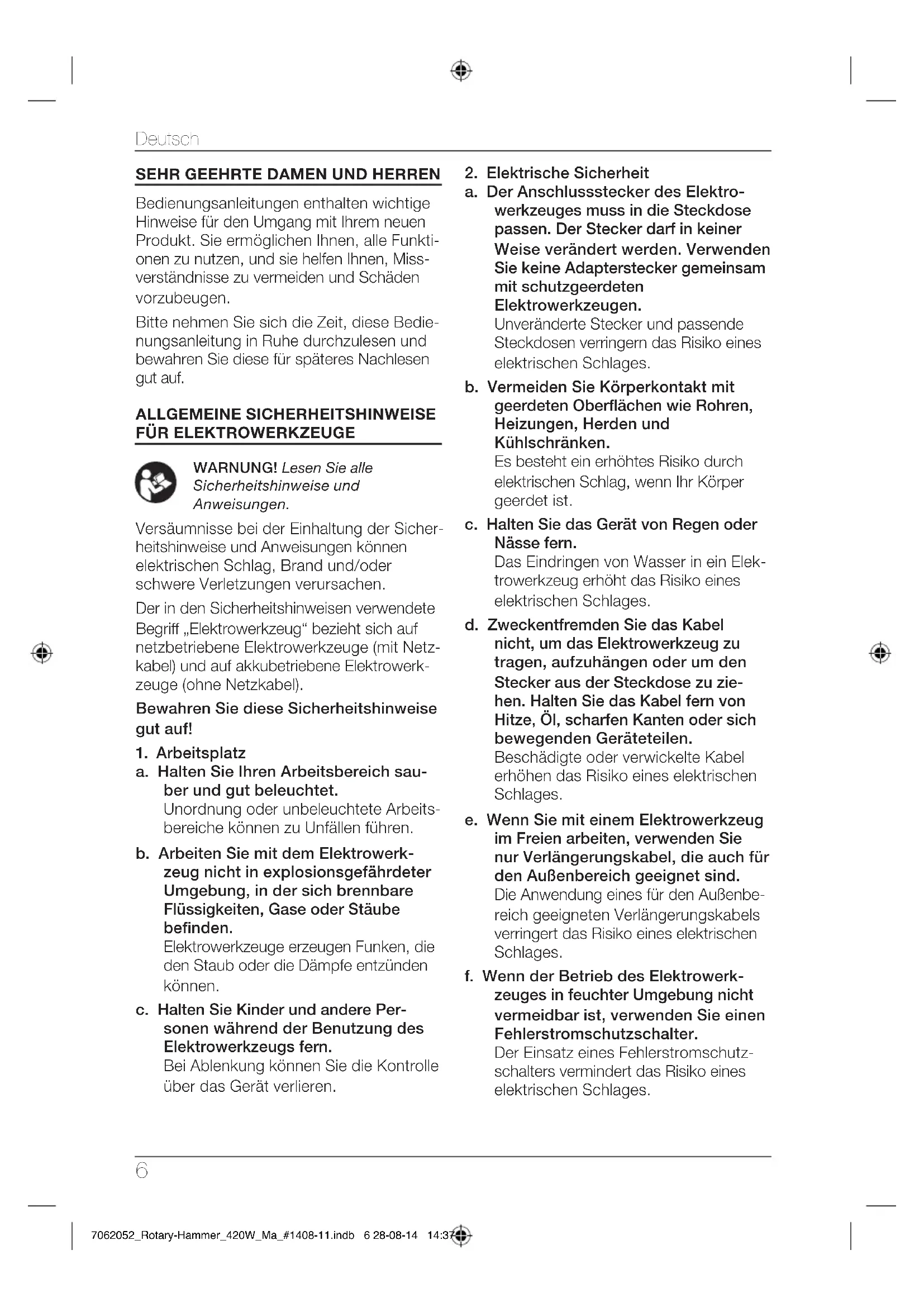 Gebrauch von Elektrowerkzeugen a. Überlasten Sie das Gerät nicht. Ver- wenden Sie für Ihre Arbeit das dafür bestimmte Elektrowerkzeug. Mit dem passenden Elektrowerkzeug arbeiten Sie besser und sicherer im angegebenen Leistungsbereich. b. Benutzen Sie kein Elektrowerkzeug, dessen Schalter defekt ist. Ein Elektrowerkzeug, das sich nicht mehr ein- oder ausschalten lässt, ist gefährlich und muss repariert werden. c. Ziehen Sie den Stecker aus der Steckdose und/oder entfernen Sie den Akku, bevor Sie Geräteeinstel- lungen vornehmen, Zubehörteile wechseln oder das Gerät weglegen. Diese Vorsichtsmaßnahme verhindert den unbeabsichtigten Start des Elektrowerkzeuges. d. Bewahren Sie unbenutzte Elektro- werkzeuge außerhalb der Reichweite von Kindern auf. Lassen Sie Per- sonen das Gerät nicht benutzen, die mit diesem nicht vertraut sind oder diese Anweisungen nicht gelesen haben. Elektrowerkzeuge sind gefährlich, wenn sie von unerfahrenen Personen benutzt werden. e. Pegen Sie das Elektrowerkzeug mit Sorgfalt. Kontrollieren Sie, ob bewegliche Geräteteile einwandfrei funktionieren und nicht klemmen, ob Teile gebrochen oder so beschädigt sind, dass die Funktion des Elektro- werkzeuges beeinträchtigt ist. Las- 7062052_Rotary-Hammer_420W_Ma_#1408-11.indb 7 28-08-14 14:37Deutsch