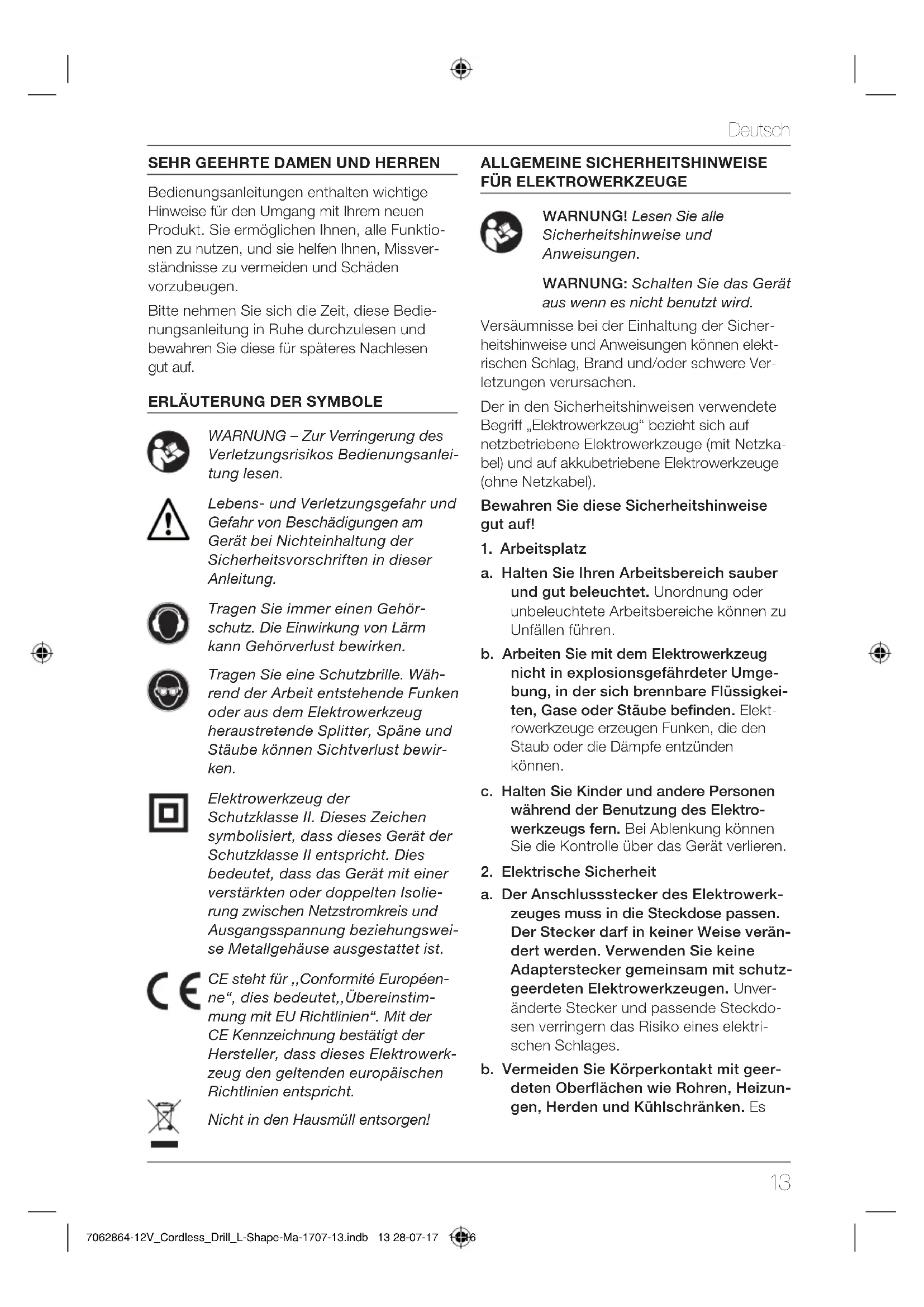 - Verwenden Sie beim Betrieb des Gerätes Schutzausrüstung einschließlich Schutz- brille oder Geschichtsschutz, Gehörschutz und Schutzkleidung einschließlich Schutz- handschuhen. Tragen Sie je nach auszu- führender Aufgabe einen Atemschutz. Dieser muss mindestens der Klasse FFP-2 entsprechen. Falls der Betrieb des Gerä- tes Beschwerden oder Unbehagen aus- löst, unterbrechen Sie die Arbeit umge- hend und gehen Sie der Ursache auf den Grund. 7062864-12V_Cordless_Drill_L-Shape-Ma-1707-13.indb 15 28-07-17 11:16Deutsch