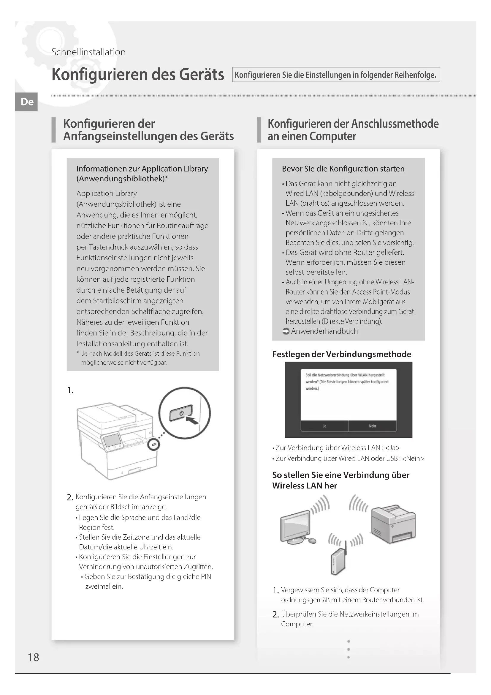 Konfigurieren Sie die Anfangseinstellungen gemäß der Bildschirmanzeige.• Legen Sie die Sprache und das Land/die Region fest.• Stellen Sie die Zeitzone und das aktuelle Datum/die aktuelle Uhrzeit ein.• Konfigurieren Sie die Einstellungen zur Verhinderung von unautorisierten Zugriffen.• Geben Sie zur Bestätigung die gleiche PIN zweimal ein.Bevor Sie die Konfiguration starten Das Gerät kann nicht gleichzeitig an Wired LAN (kabelgebunden) und Wireless LAN (drahtlos) angeschlossen werden. Wenn das Gerät an ein ungesichertes Netzwerk angeschlossen ist, könnten Ihre persönlichen Daten an Dritte gelangen. Beachten Sie dies, und seien Sie vorsichtig.• Das Gerät wird ohne Router geliefert. Wenn erforderlich, müssen Sie diesen selbst bereitstellen. Auch in einer Umgebung ohne Wireless LAN-Router können Sie den Access Point-Modus verwenden, um von Ihrem Mobilgerät aus eine direkte drahtlose Verbindung zum Gerät herzustellen (Direkte Verbindung). AnwenderhandbuchFestlegen der Verbindungsmethode• Zur Verbindung über Wireless LAN : <Ja> Zur Verbindung über Wired LAN oder USB : <Nein>So stellen Sie eine Verbindung über Wireless LAN her Vergewissern Sie sich, dass der Computer ordnungsgemäß mit einem Router verbunden ist. Überprüfen Sie die Netzwerkeinstellungen im Computer.