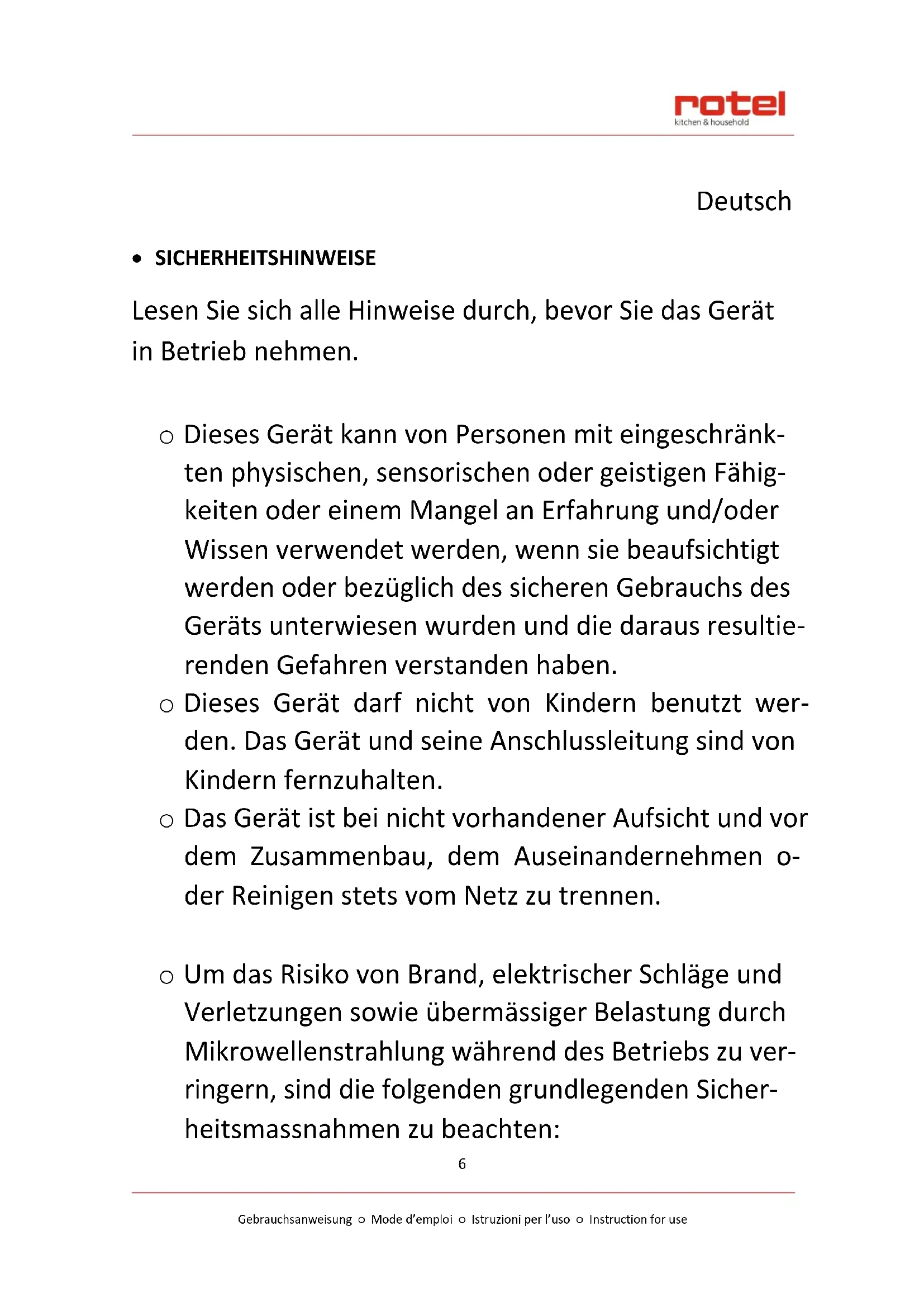 - SICHERHEITSHINWEISE Lesen Sie sich alle Hinweise durch, bevor Sie das Gerät in Betrieb nehmen. o Dieses Gerät kann von Personen mit eingeschränk- ten physischen, sensorischen oder geistigen Fähig- keiten oder einem Mangel an Erfahrung und/oder Wissen verwendet werden, wenn sie beaufsichtigt werden oder bezüglich des sicheren Gebrauchs des Geräts unterwiesen wurden und die daraus resultie- renden Gefahren verstanden haben. o Dieses Gerät darf nicht von Kindern benutzt wer- den. Das Gerät und seine Anschlussleitung sind von Kindern fernzuhalten. o Das Gerät ist bei nicht vorhandener Aufsicht und vor dem Zusammenbau, dem Auseinandernehmen o- der Reinigen stets vom Netz zu trennen. o Um das Risiko von Brand, elektrischer Schläge und Verletzungen sowie übermässiger Belastung durch Mikrowellenstrahlung während des Betriebs zu ver- ringern, sind die folgenden grundlegenden Sicher- heitsmassnahmen zu beachten:Gebrauchsanweisung ○ Mode d’emploi ○ Istruzioni per l’uso ○ Instruction for use