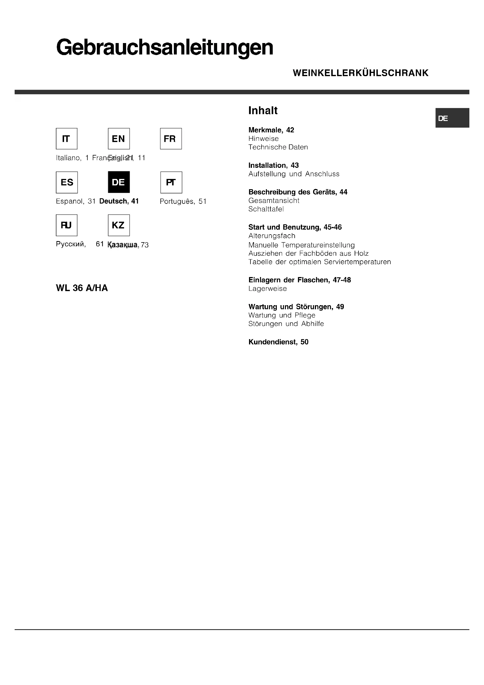 195092483.0108/2012DE FORNO WL 36 A/HA Inhalt Merkmale, 42 Hinweise Technische Daten Installation, 43 Aufstellung und Anschluss Beschreibung des Geräts, 44 Gesamtansicht Schalttafel Start und Benutzung, 45-46 Alterungsfach Manuelle Temperatureinstellung Ausziehen der Fachböden aus Holz Tabelle der optimalen Serviertemperaturen Einlagern der Flaschen, 47-48 Lagerweise Wartung und Störungen, 49 Wartung und Pflege Störungen und Abhilfe Kundendienst, 50 Italiano, 1 Français, 21 Espanol, 31 Deutsch, 41 English, 11