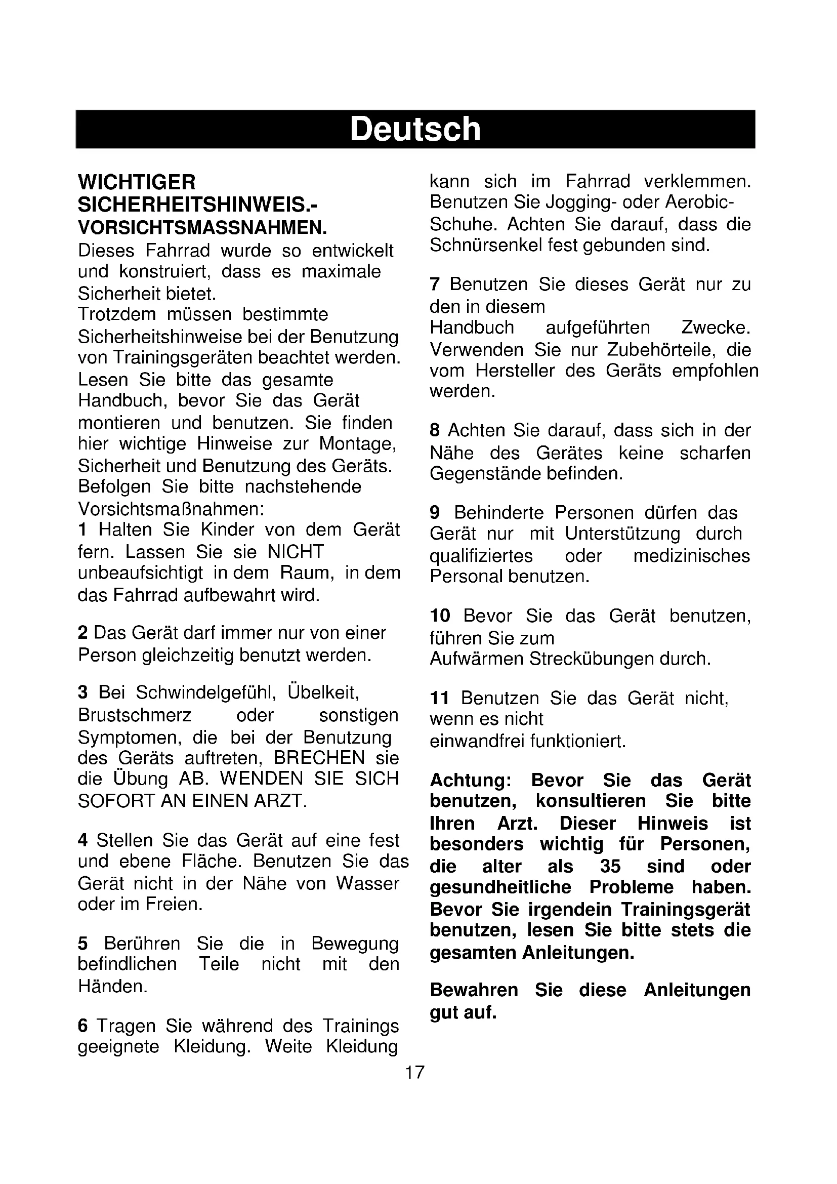 Deutsch WICHTIGER SICHERHEITSHINWEIS.- VORSICHTSMASSNAHMEN. Dieses Fahrrad wurde so entwickelt und konstruiert, dass es maximale Sicherheit bietet. Trotzdem müssen bestimmte Sicherheitshinweise bei der Benutzung von Trainingsgeräten beachtet werden. Lesen Sie bitte das gesamte Handbuch, bevor Sie das Gerät montieren und benutzen. Sie finden hier wichtige Hinweise zur Montage, Sicherheit und Benutzung des Geräts. Befolgen Sie bitte nachstehende Vorsichtsmaßnahmen: 1 Halten Sie Kinder von dem Gerät fern. Lassen Sie sie NICHT unbeaufsichtigt in dem Raum, in dem das Fahrrad aufbewahrt wird. 2 Das Gerät darf immer nur von einer Person gleichzeitig benutzt werden. 3 Bei Schwindelgefühl, Übelkeit, Brustschmerz oder sonstigen Symptomen, die bei der Benutzung des Geräts auftreten, BRECHEN sie die Übung AB. WENDEN SIE SICH SOFORT AN EINEN ARZT. 4 Stellen Sie das Gerät auf eine fest und ebene Fläche. Benutzen Sie das Gerät nicht in der Nähe von Wasser oder im Freien. 5 Berühren Sie die in Bewegung befindlichen Teile nicht mit den Händen. 6 Tragen Sie während des Trainings geeignete Kleidung. Weite Kleidung kann sich im Fahrrad verklemmen. Benutzen Sie Jogging- oder Aerobic- Schuhe. Achten Sie darauf, dass die Schnürsenkel fest gebunden sind. 7 Benutzen Sie dieses Gerät nur zu den in diesem Handbuch aufgeführten Zwecke. Verwenden Sie nur Zubehörteile, die vom Hersteller des Geräts empfohlen werden. 8 Achten Sie darauf, dass sich in der Nähe des Gerätes keine scharfen Gegenstände befinden. 9 Behinderte Personen dürfen das Gerät nur mit Unterstützung durch qualifiziertes oder medizinisches Personal benutzen. 10 Bevor Sie das Gerät benutzen, führen Sie zum Aufwärmen Streckübungen durch. 11 Benutzen Sie das Gerät nicht, wenn es nicht einwandfrei funktioniert. Achtung: Bevor Sie das Gerät benutzen, konsultieren Sie bitte Ihren Arzt. Dieser Hinweis ist besonders wichtig für Personen, die alter als 35 sind oder gesundheitliche Probleme haben. Bevor Sie irgendein Trainingsgerät benutzen, lesen Sie bitte stets die gesamten Anleitungen. Bewahren Sie diese Anleitungen gut auf.18