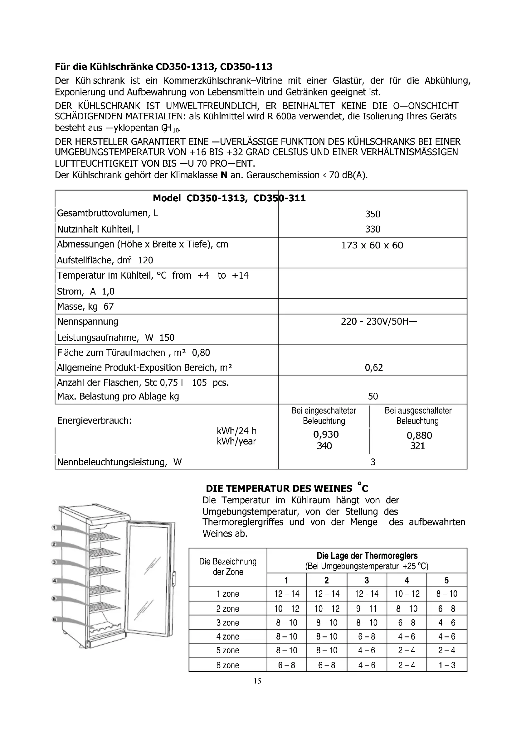 Für die Kühlschränke CD350-1313, CD350-113 Der Kühlschrank ist ein Kommerzkühlschrank–Vitrine mit einer Glastür, der für die Abkühlung, Exponierung und Aufbewahrung von Lebensmitteln und Getränken geeignet ist. DER KÜHLSCHRANK IST UMWELTFREUNDLICH, ER BEINHALTET KEINE DIE OZONSCHICHT SCHÄDIGENDEN MATERIALIEN: als Kühlmittel wird R 600a verwendet, die Isolierung Ihres Geräts besteht aus Zyklopentan C